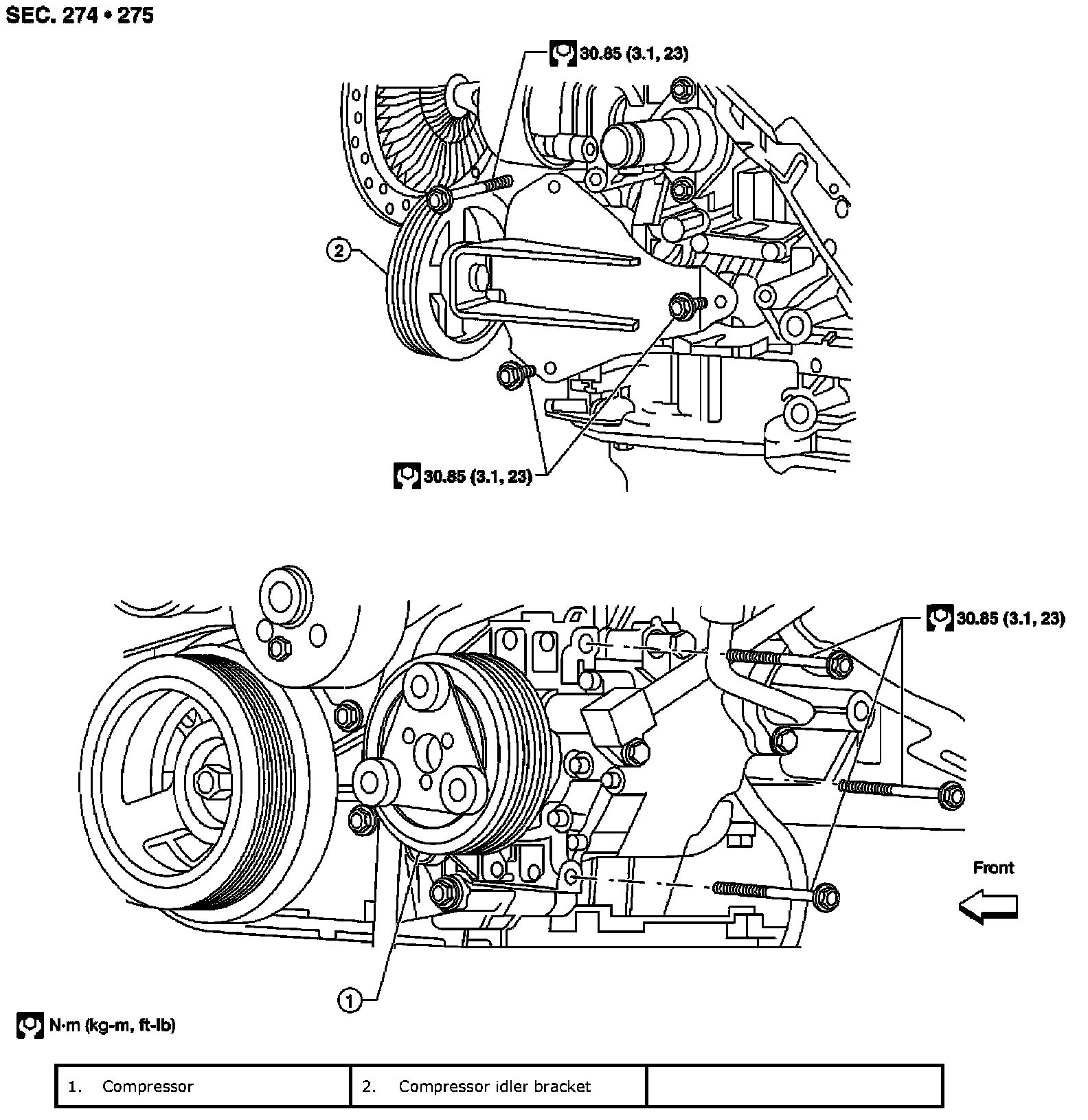 NOTE: For the QR25DE engine, the upper compressor bolt is longer than the other compressor bolts and can only be removed by repositioning the compressor after all the bolts have been loosened.