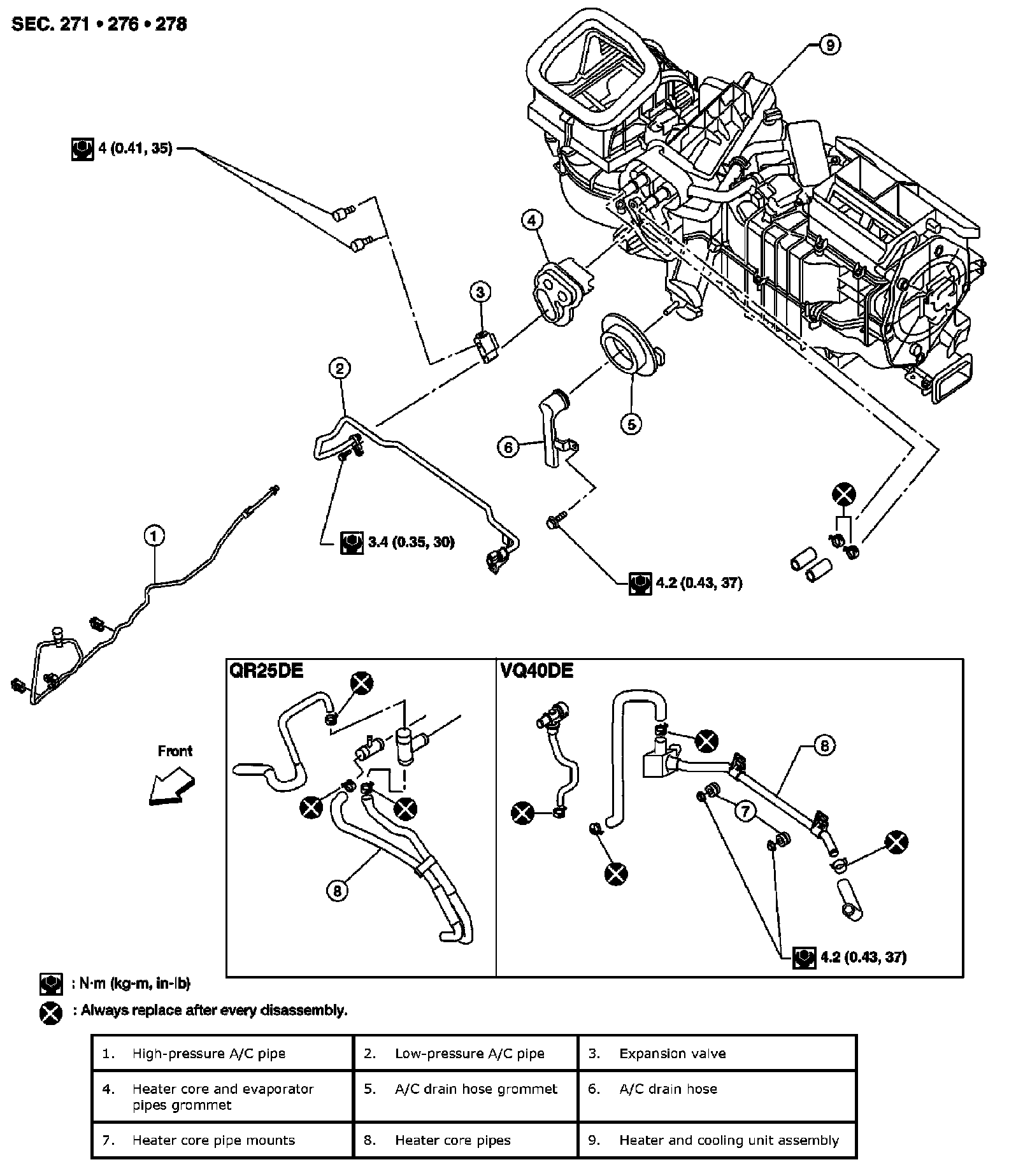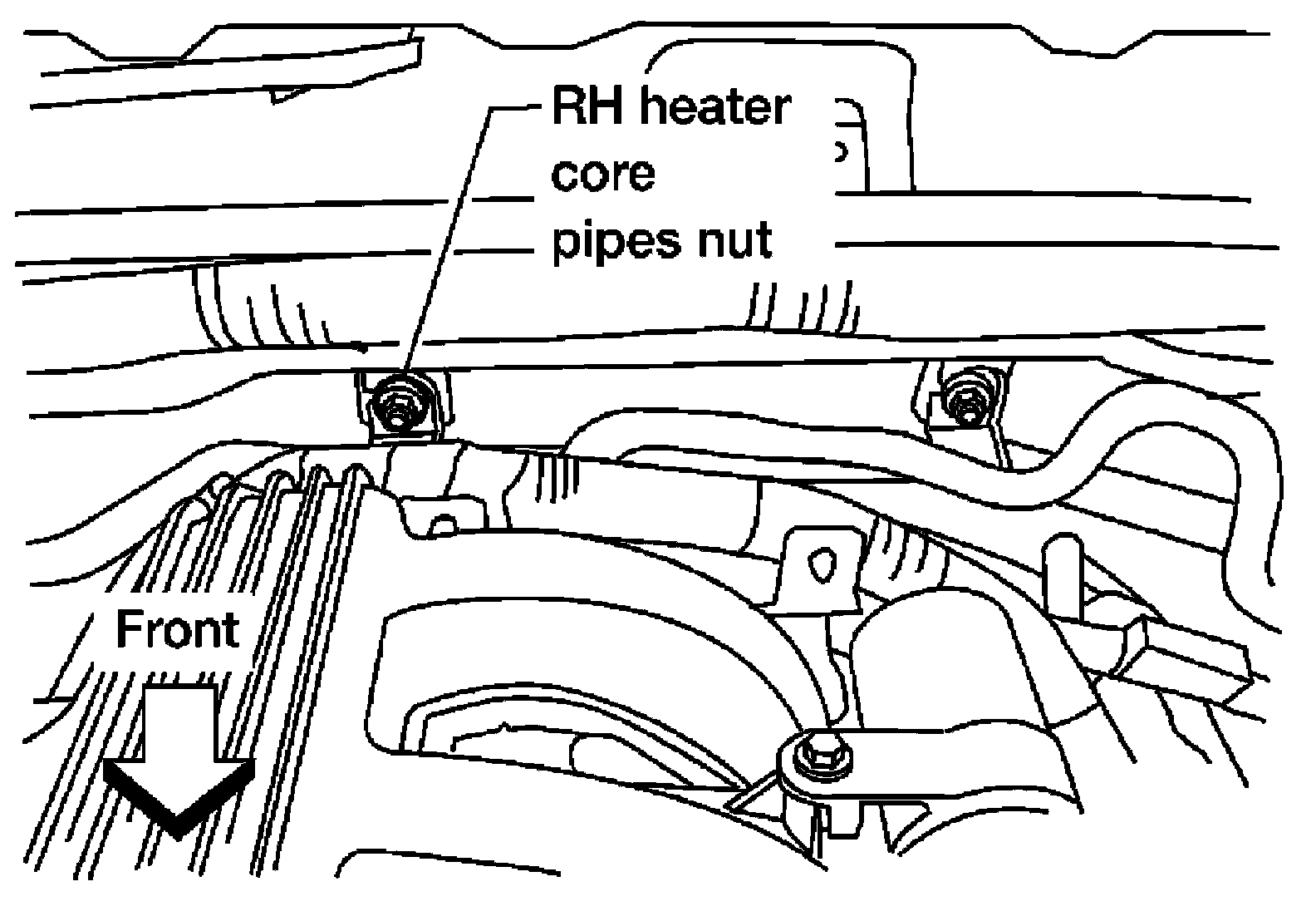 5. For vehicles equipped with the VQ40DE engine, remove the RH heater core pipes nut.