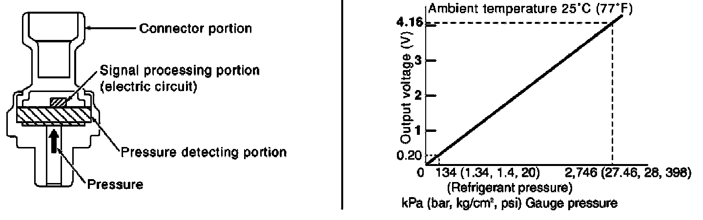The refrigerant pressure sensor is installed at the condenser of the air conditioner system. The sensor uses an electrostatic volume pressure transducer to convert refrigerant pressure to voltage. The voltage signal is sent to ECM, and ECM controls cooling fan system.