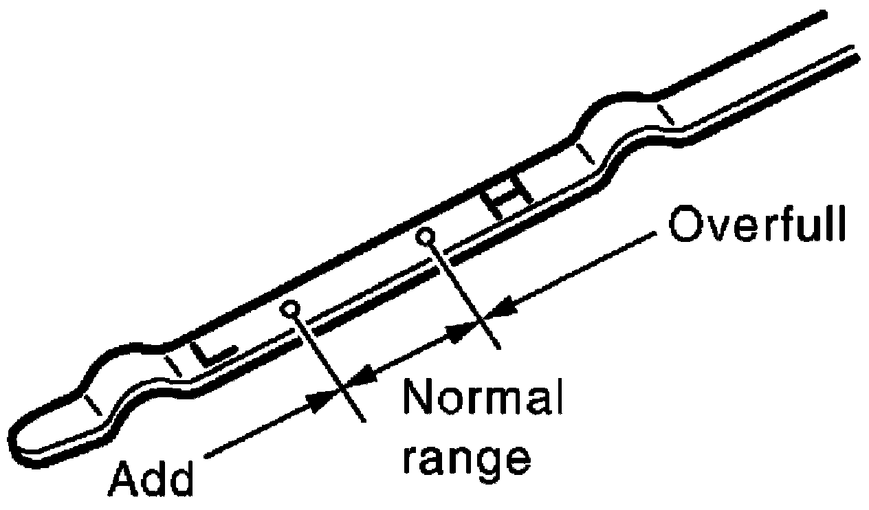8. Check the oil level using the dipstick as shown. Add oil as necessary and install the oil filler cap. Refer to [Engine Oil Inspection [QR25DE]].