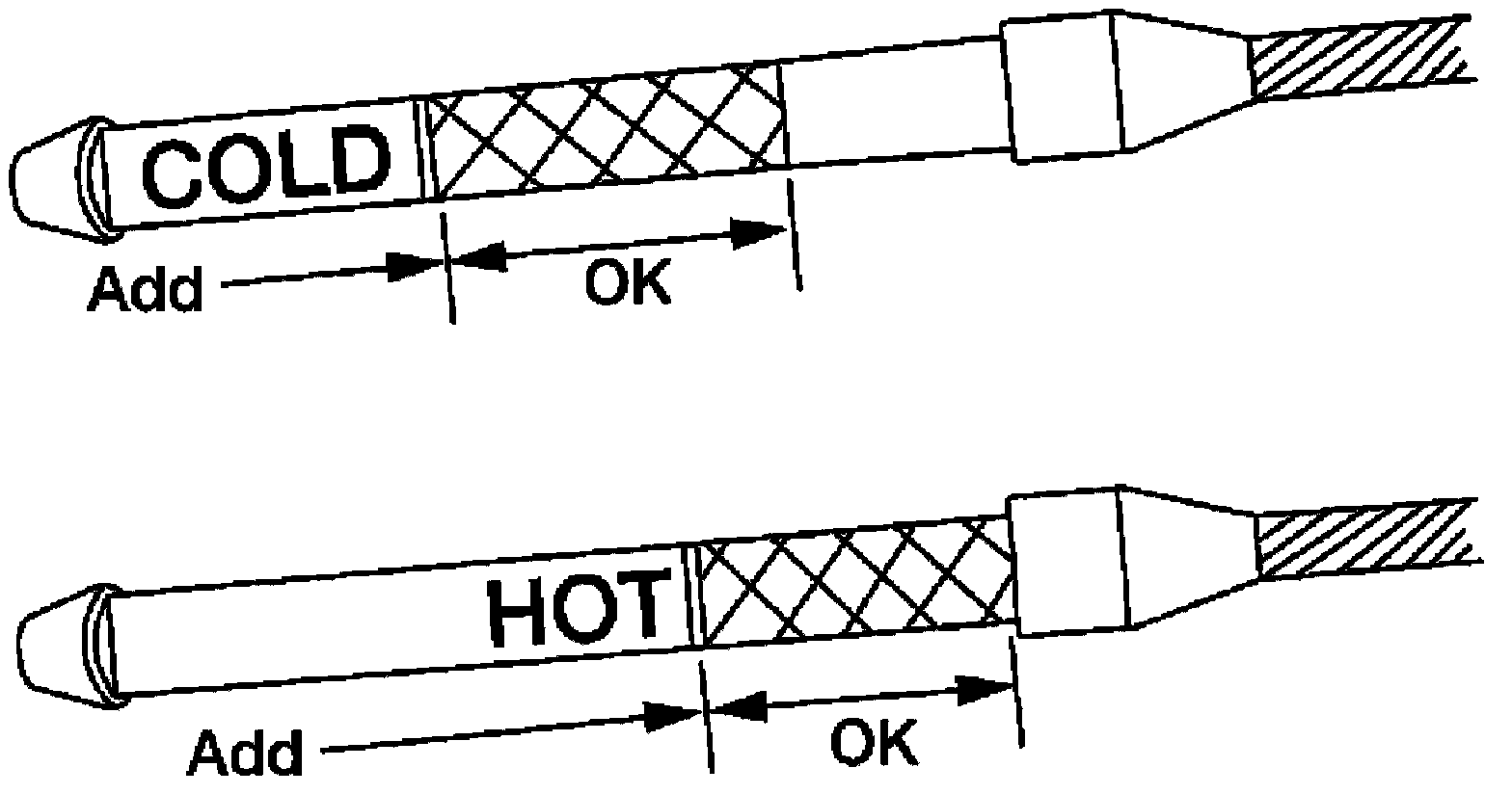6. Re-check the A/T fluid level at A/T fluid temperatures of approximately 65 °C (149 °F) using the "HOT" range on the A/T fluid level gauge as shown. The HOT range is between 50° - 80 °C (122° - 176 °F).
