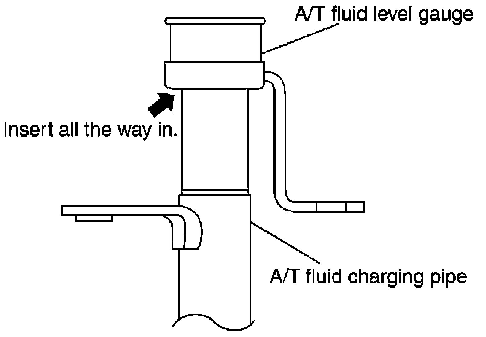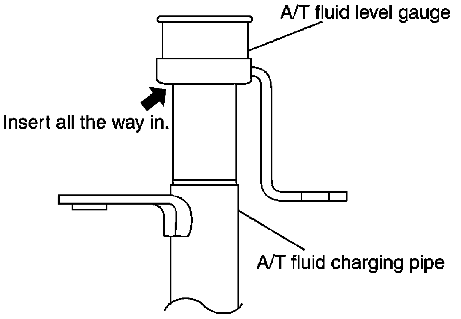 - To check the A/T fluid level, insert the A/T fluid level gauge until the cap contacts the top of the A/T fluid charging pipe, with the gauge reversed from the normal inserted position as shown.