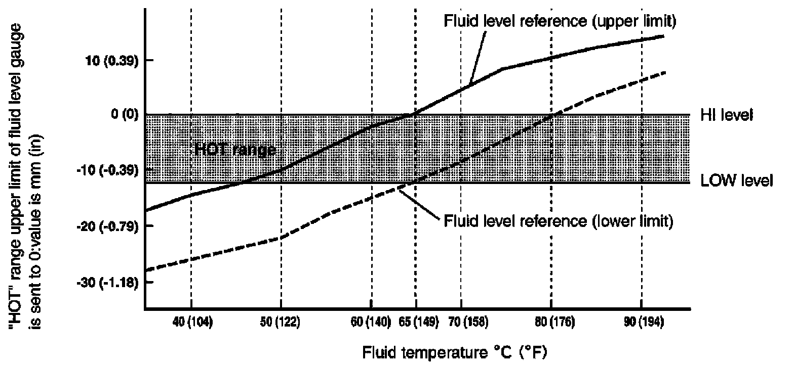 NOTE: The A/T fluid level will be significantly affected by the A/T fluid temperature as shown. Therefore monitor the A/T fluid temperature data using the SDT.