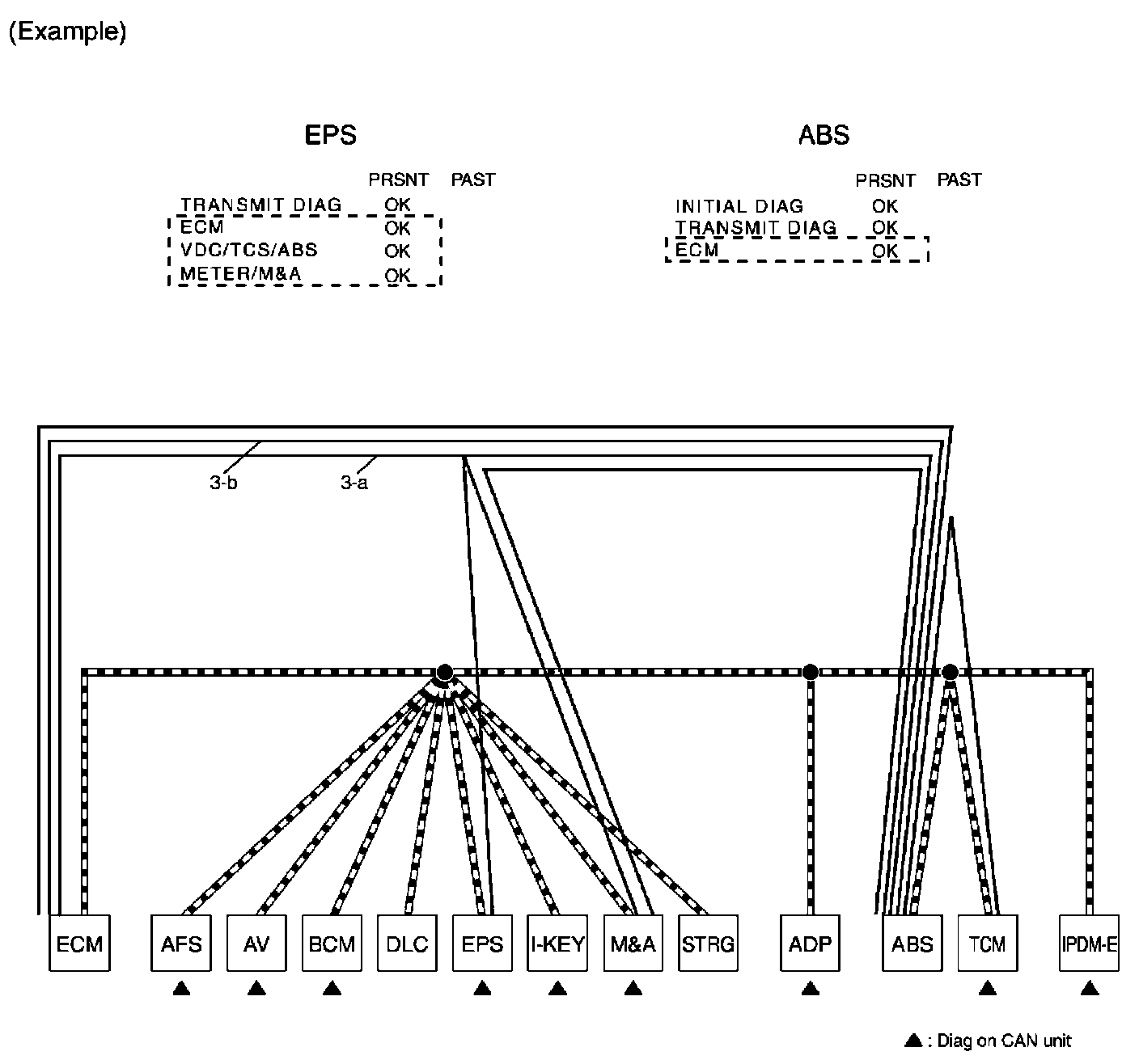 a. Reception item of "EPS": Assume that the unit could not receive the signals from ECM, ABS, and M&A. Draw a line among EPS, ECM, ABS, and M&A (line 3-a in the figure below).