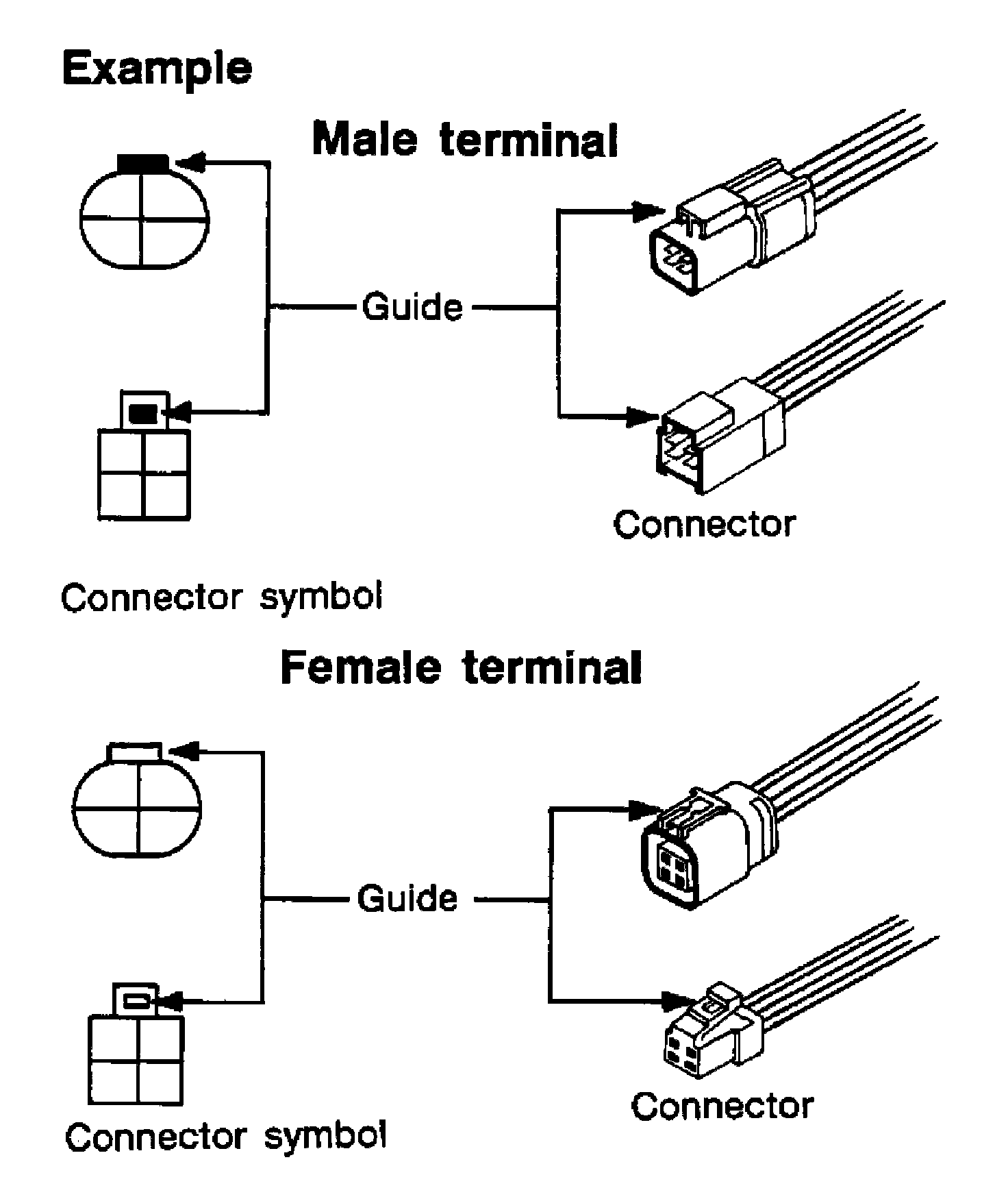 Connector guides for male terminals are shown in black and female terminals in white in wiring diagrams.