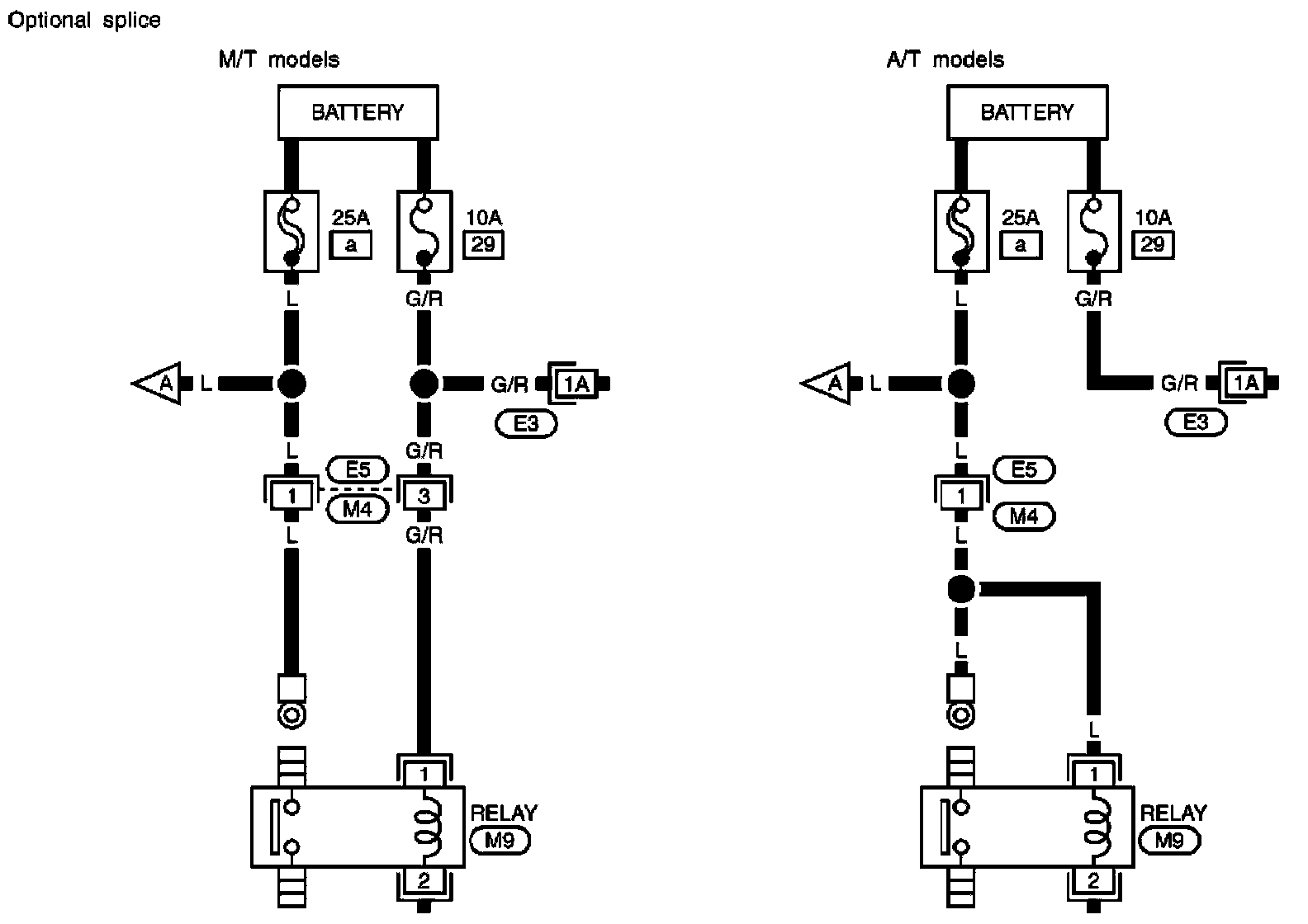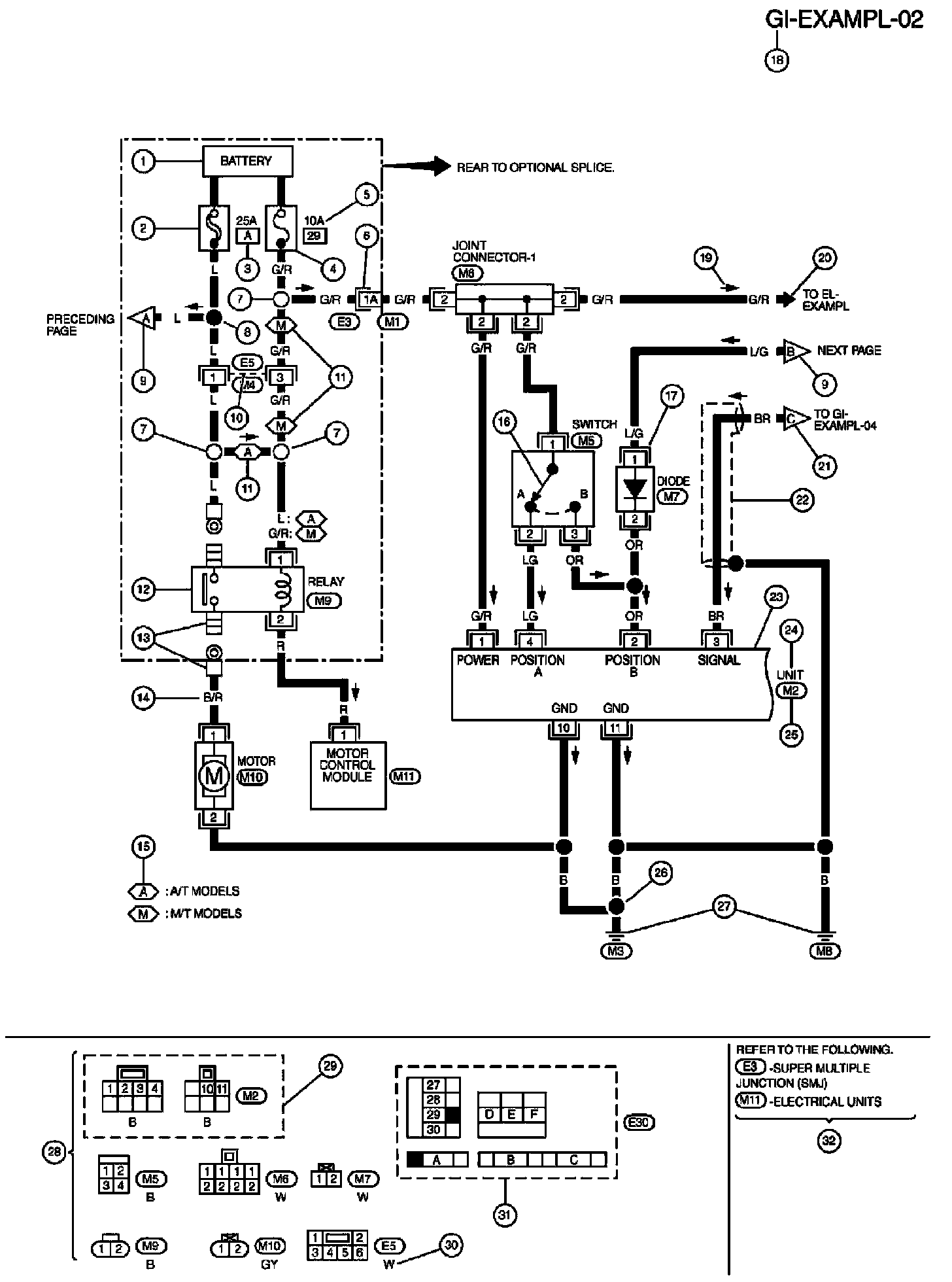 - Connector numbers in a single circle M33 indicate harness connectors.