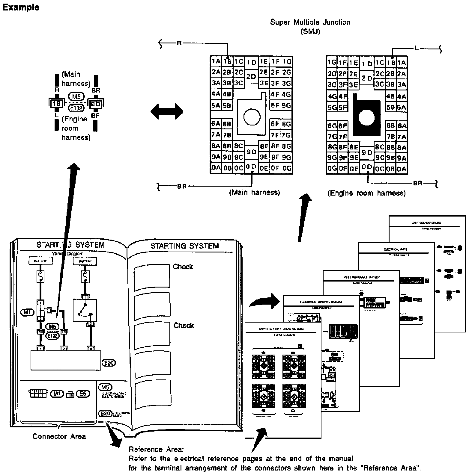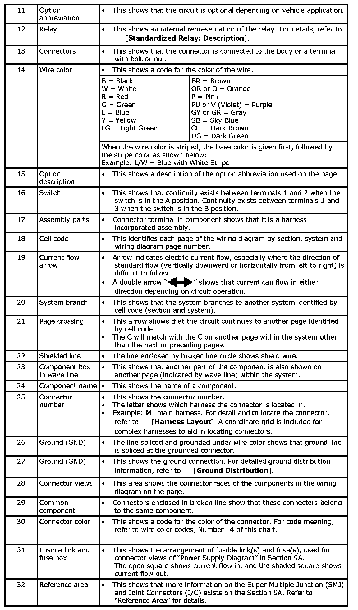 The Reference Area of the wiring diagram contains references to additional electrical reference pages at the end of the manual. If connector numbers and titles are shown in the Reference Area of the wiring diagram, these connector symbols are not shown in the Connector Area.