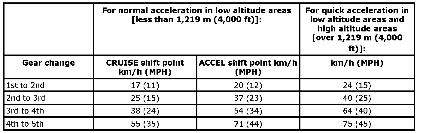 Shown below are suggested vehicle speeds for shifting into a higher gear. These suggestions relate to fuel economy and vehicle performance. Actual upshift speeds will vary according to road conditions, the weather and individual driving habits.