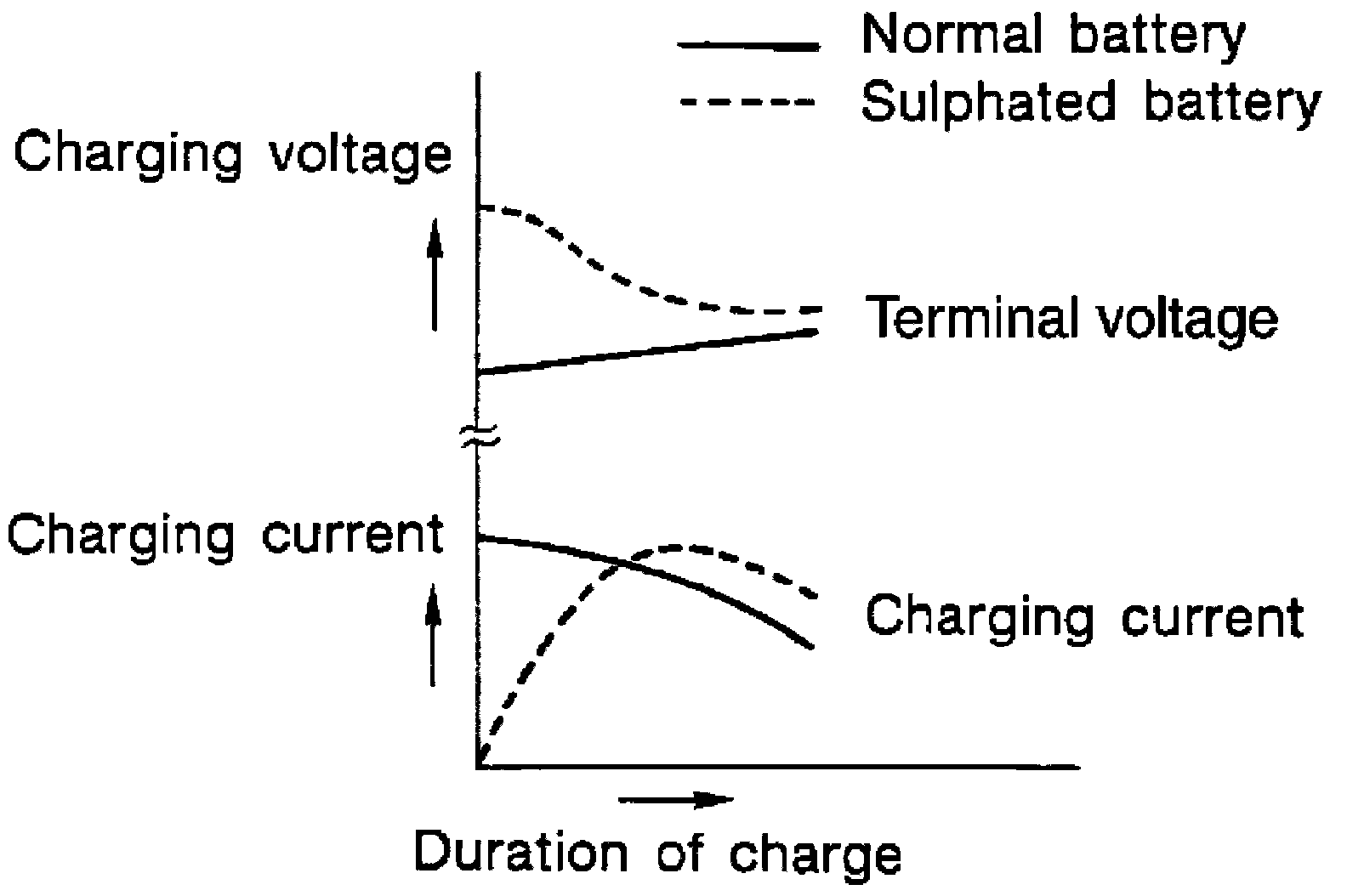 To determine if a battery has been "sulphated", note its voltage and current when charging it. As shown in the figure, less current and higher voltage are observed in the initial stage of charging sulphated batteries.