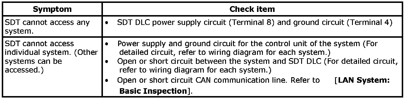 NOTE: The CAN and DDL2 circuits from DLC pins 6, 7 and 14 may be connected to more than one system. A short in any circuit connected to a control unit in one system may affect SDT access to other systems.