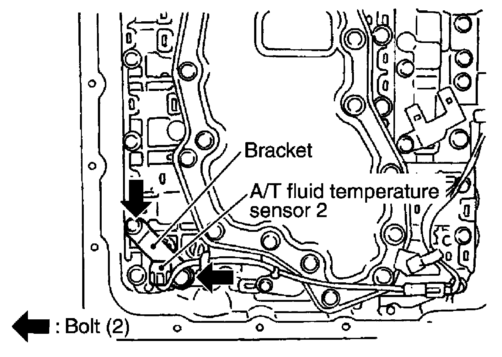 ii) Install A/T fluid temperature sensor 2 (with bracket) to control valve with TCM. Tighten A/T fluid temperature sensor 2 bolt to the specified torque.