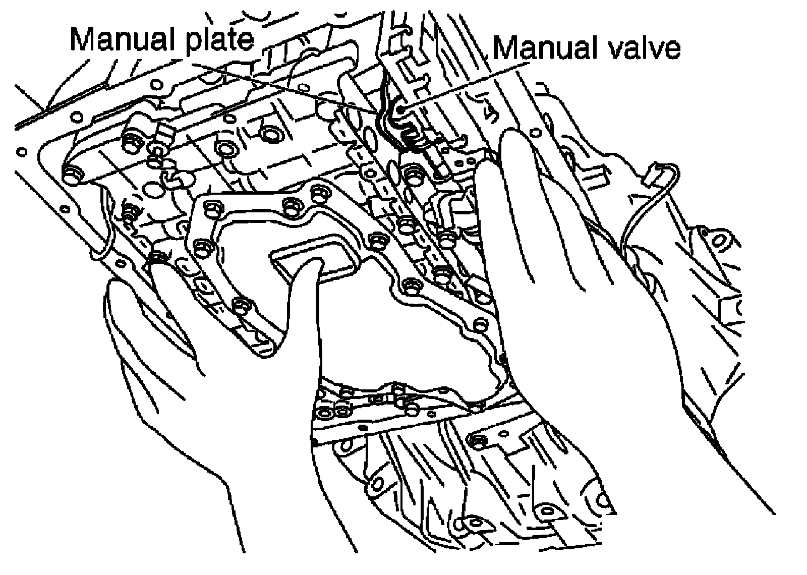 ^ Assemble it so that manual valve cutout is engaged with manual plate projection.