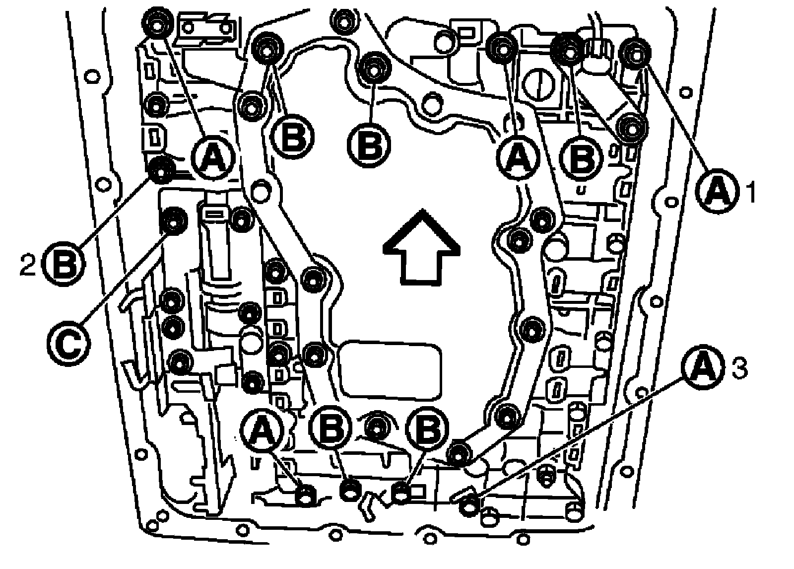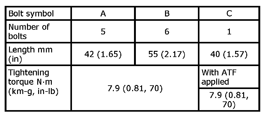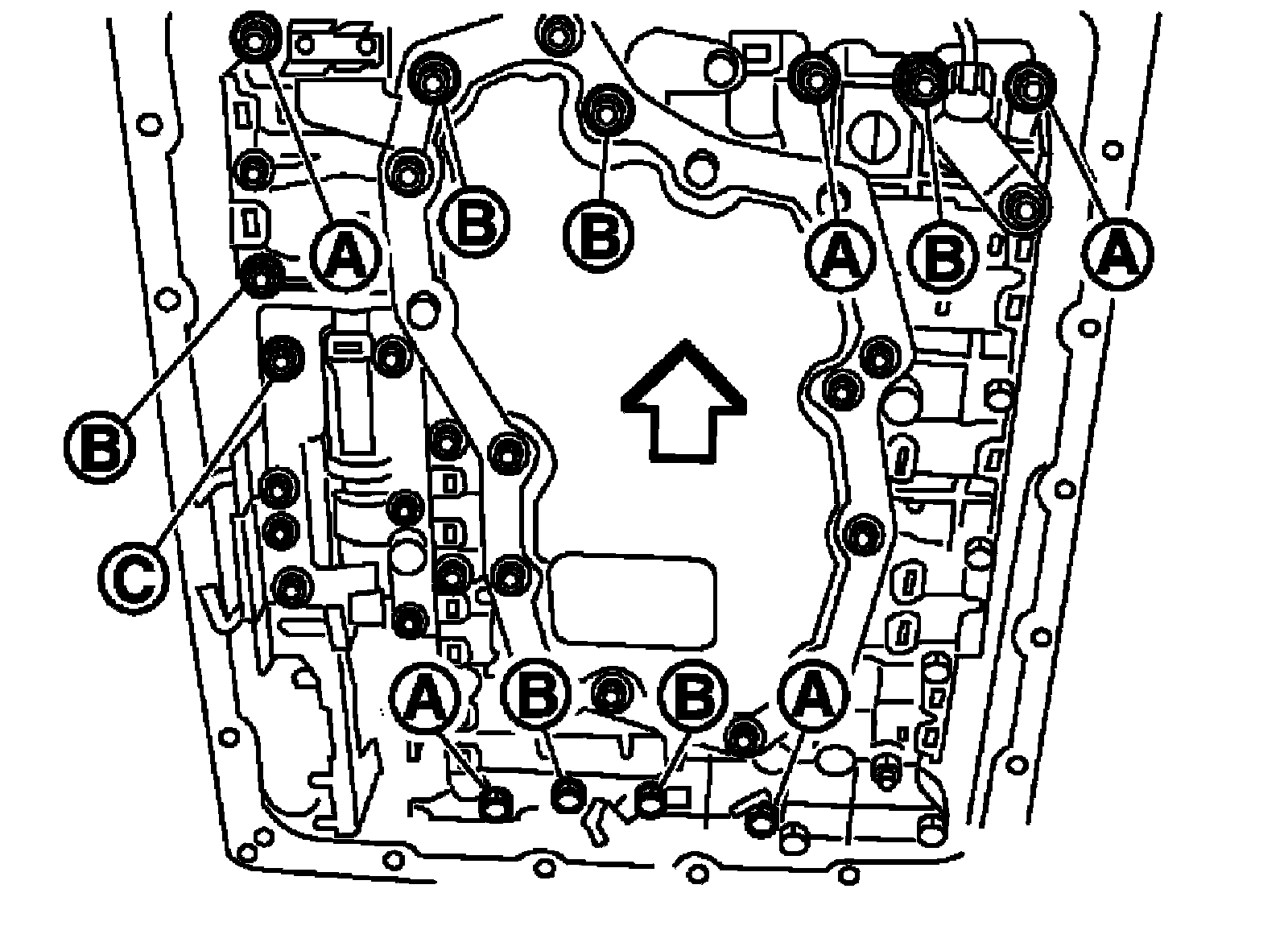 10) Remove bolts (A), (B) and (C) from control valve with TCM.