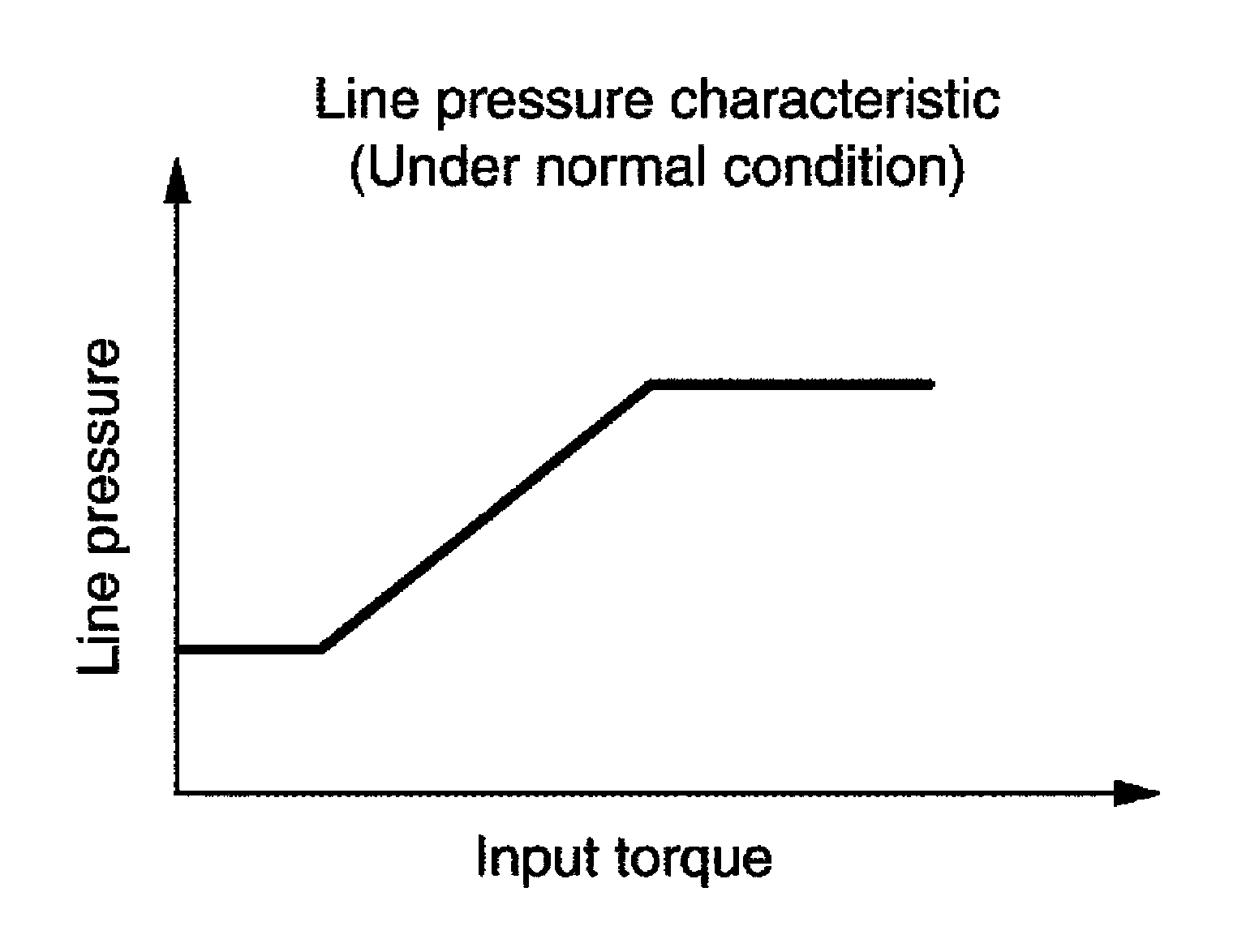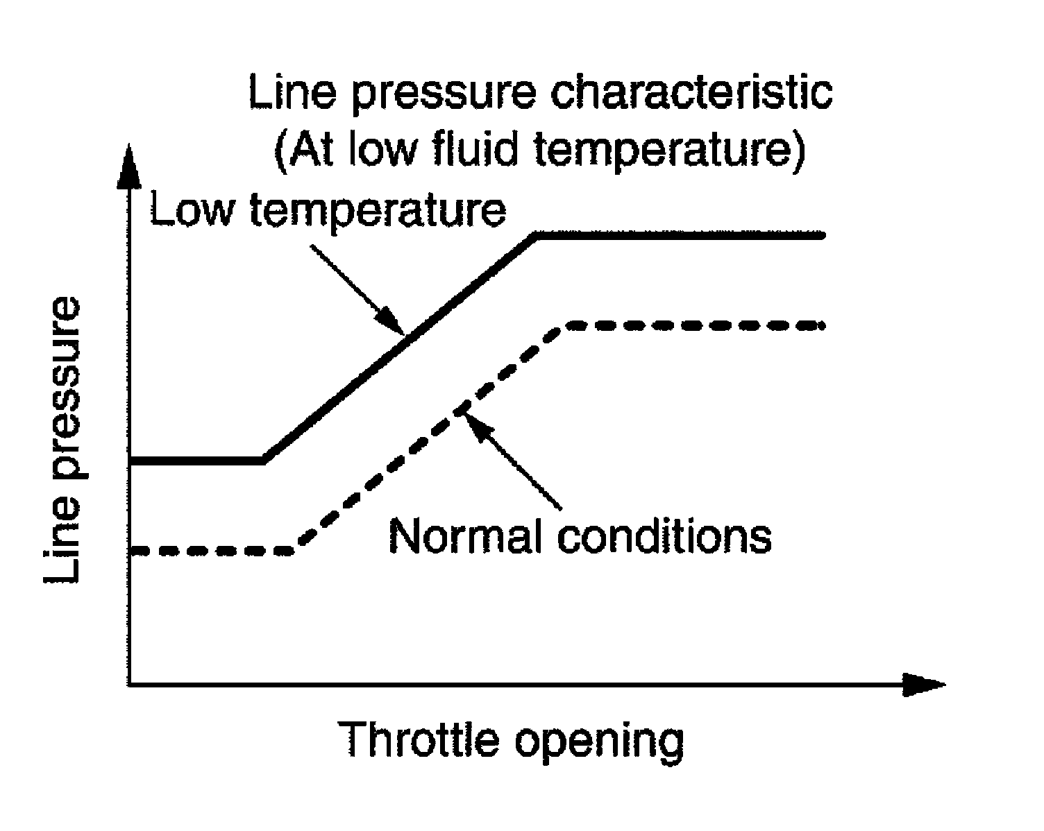 When the A/T fluid temperature drops below the prescribed temperature, in order to speed up the action of each friction element, the line pressure is set higher than the normal line pressure characteristic.