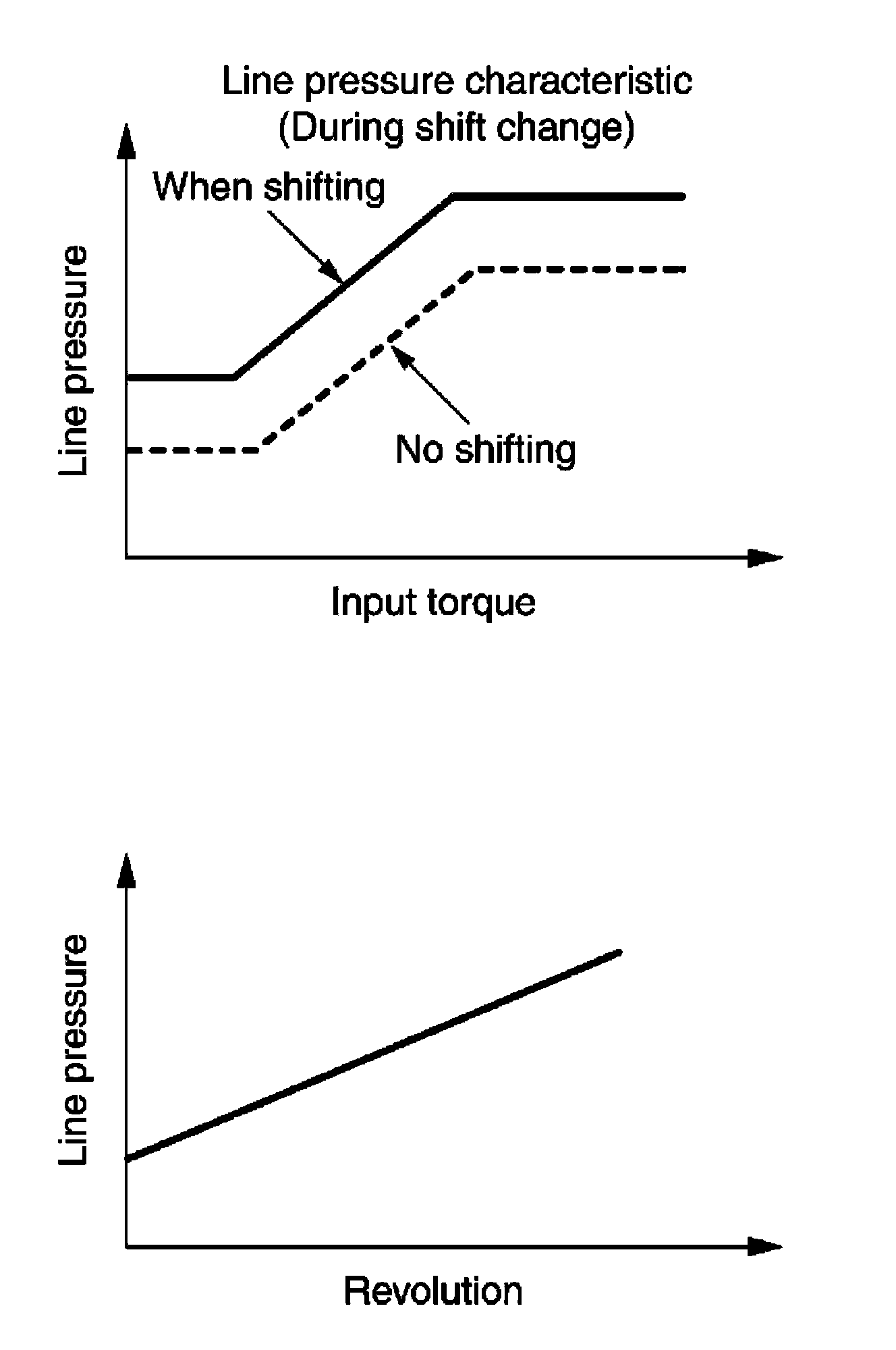 The necessary and adequate line pressure for shift change is set. For this reason, line pressure pattern setting corresponds to input torque and gearshift selection. Also, line pressure characteristic is set according to engine speed, during engine brake operation.