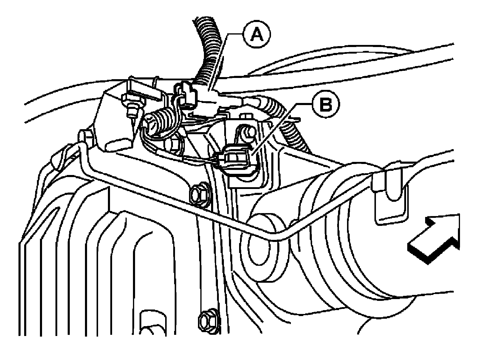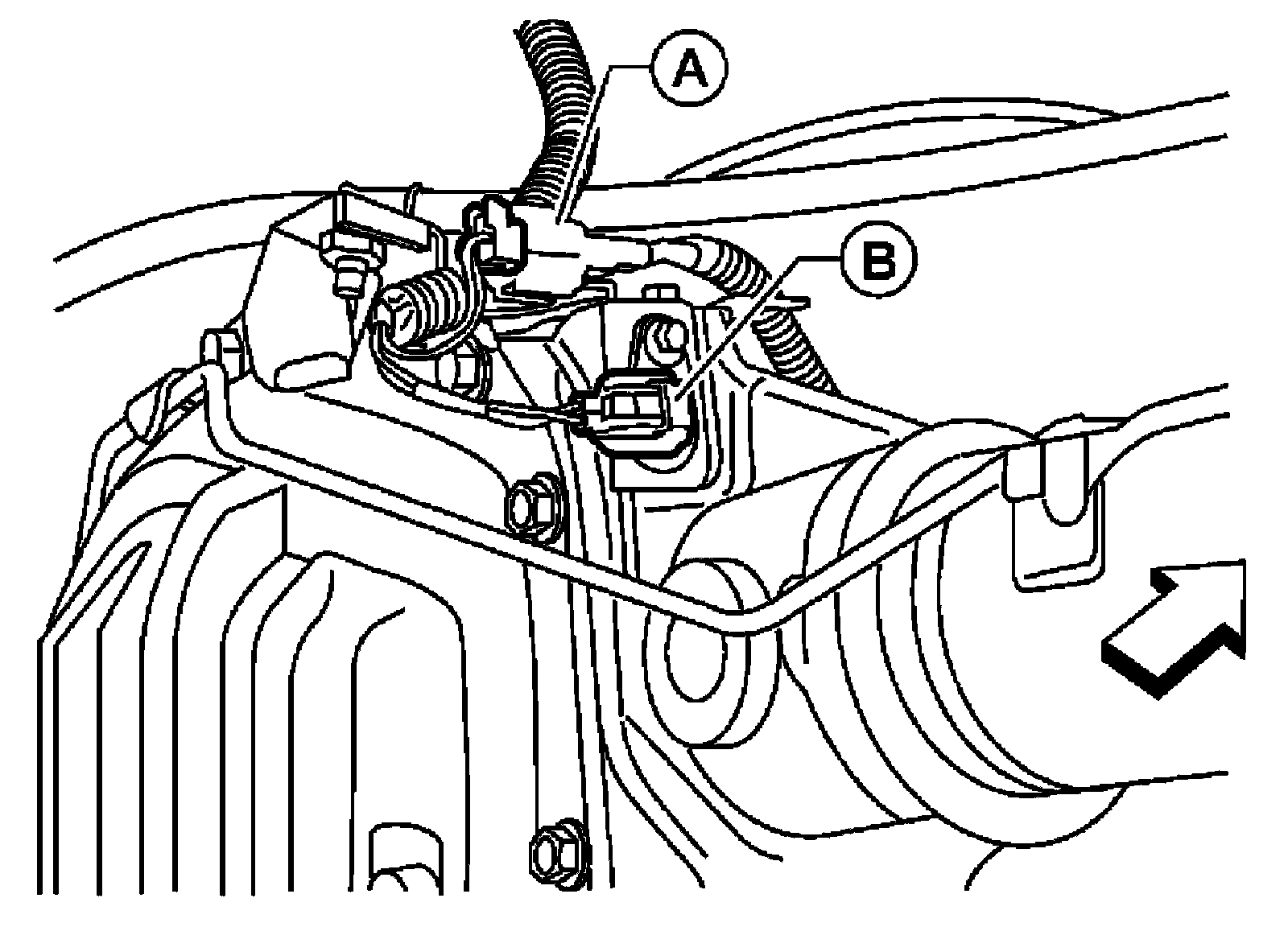 5) Remove differential lock solenoid connector (B) bolt and disconnect differential lock position connector (A).