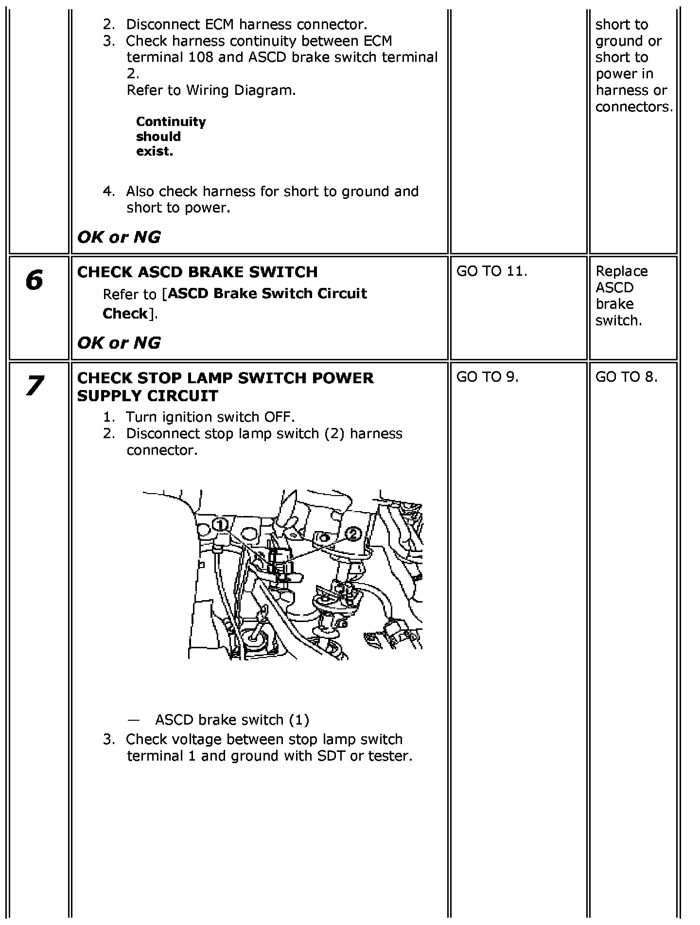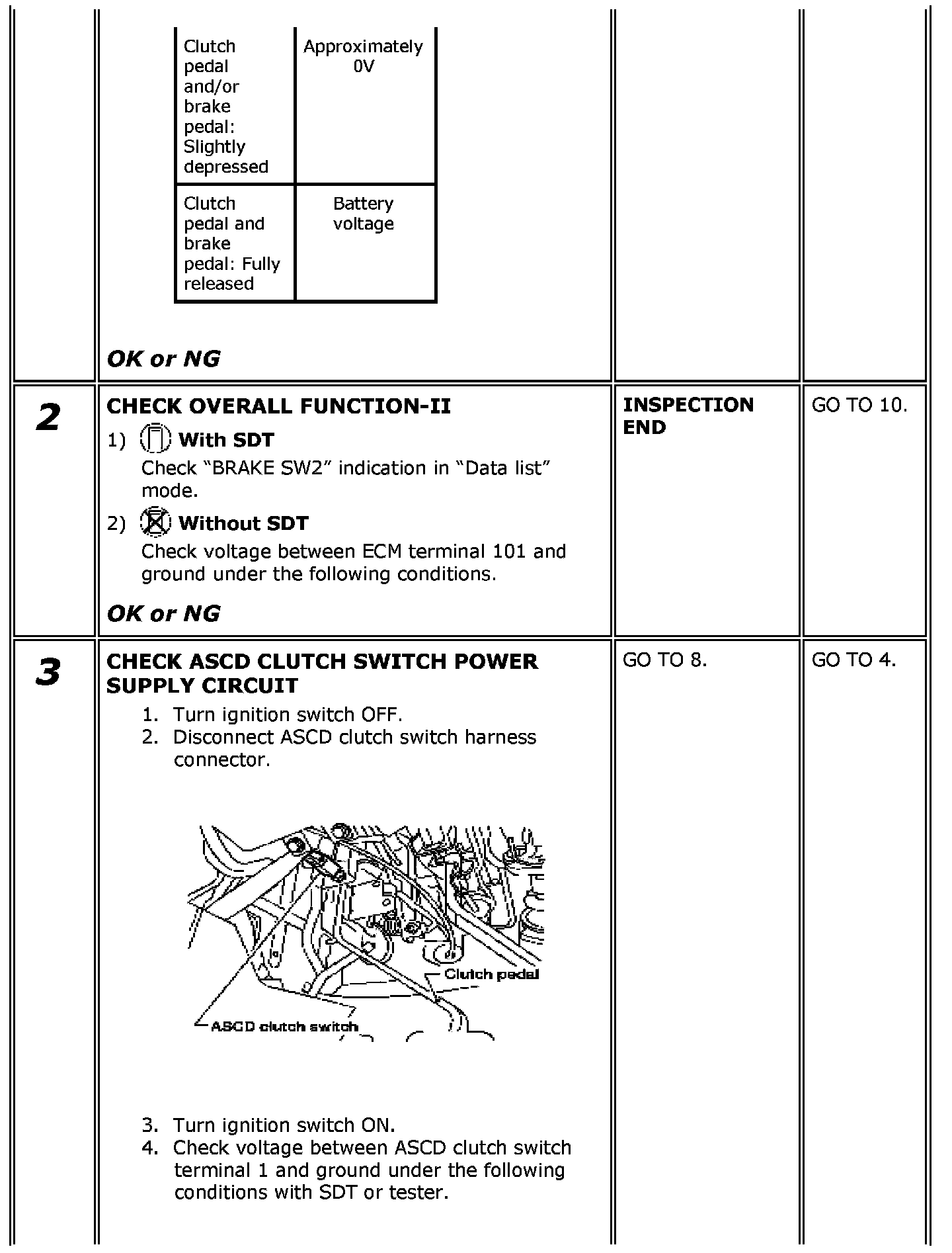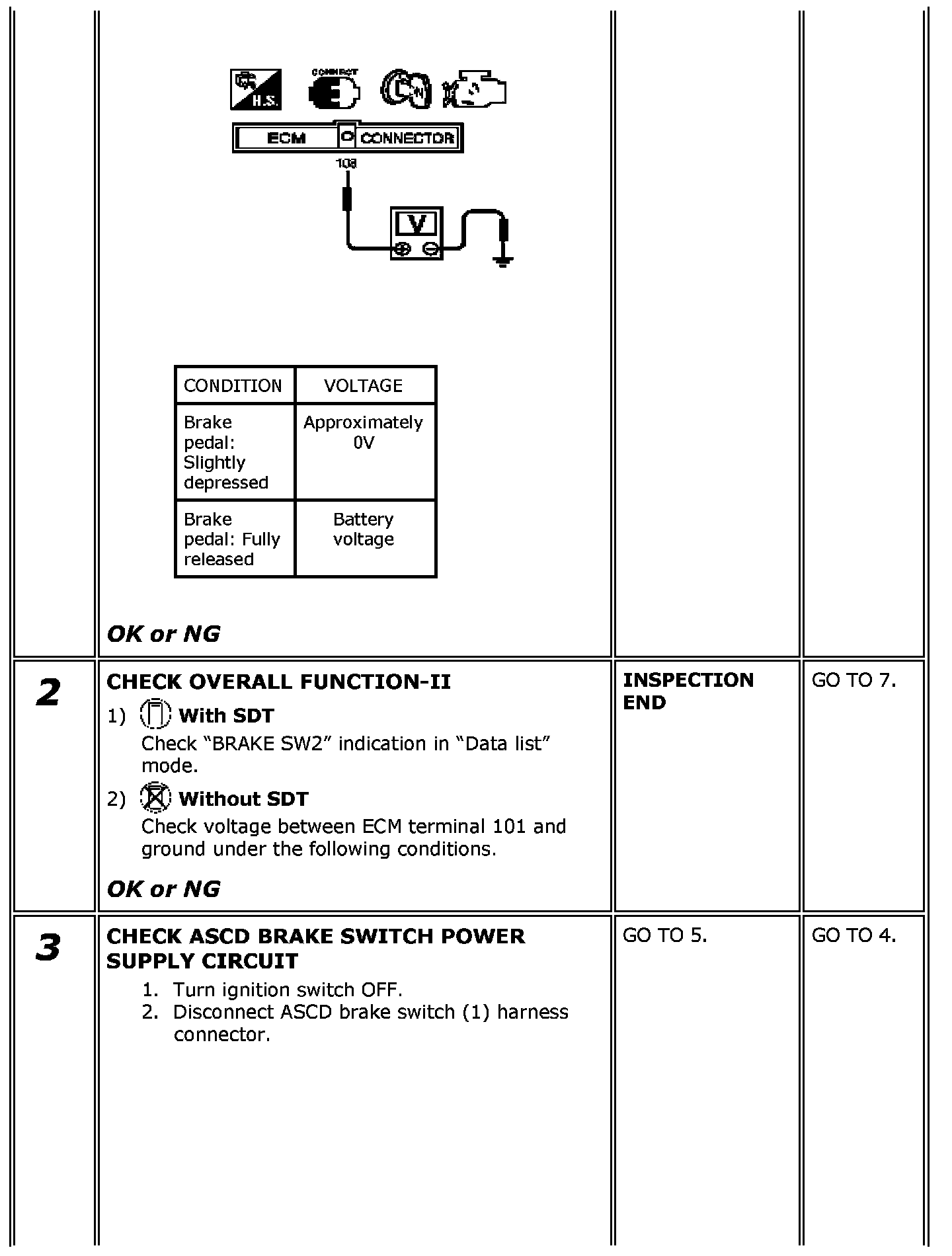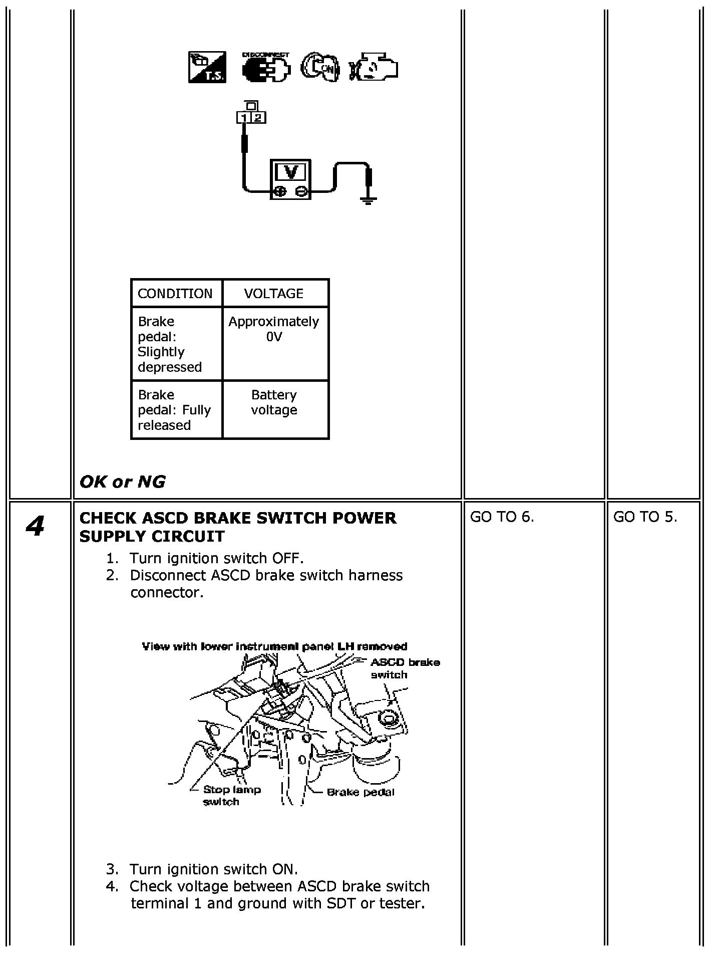 If NG, adjust ASCD brake switch installation, refer to [Brake Pedal: Inspection and Adjustment], Adjustments and perform step 3 again.
