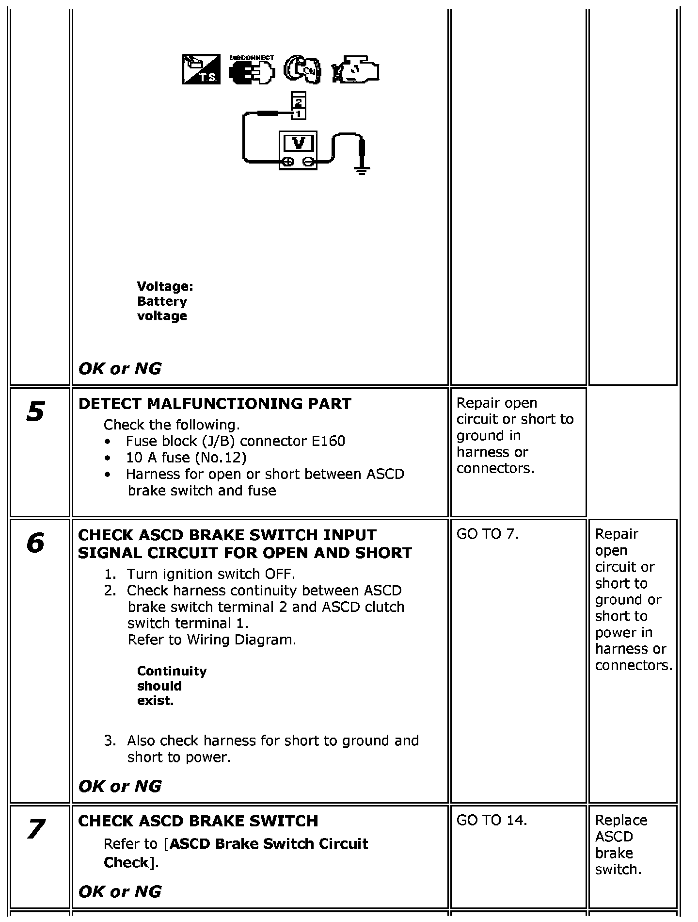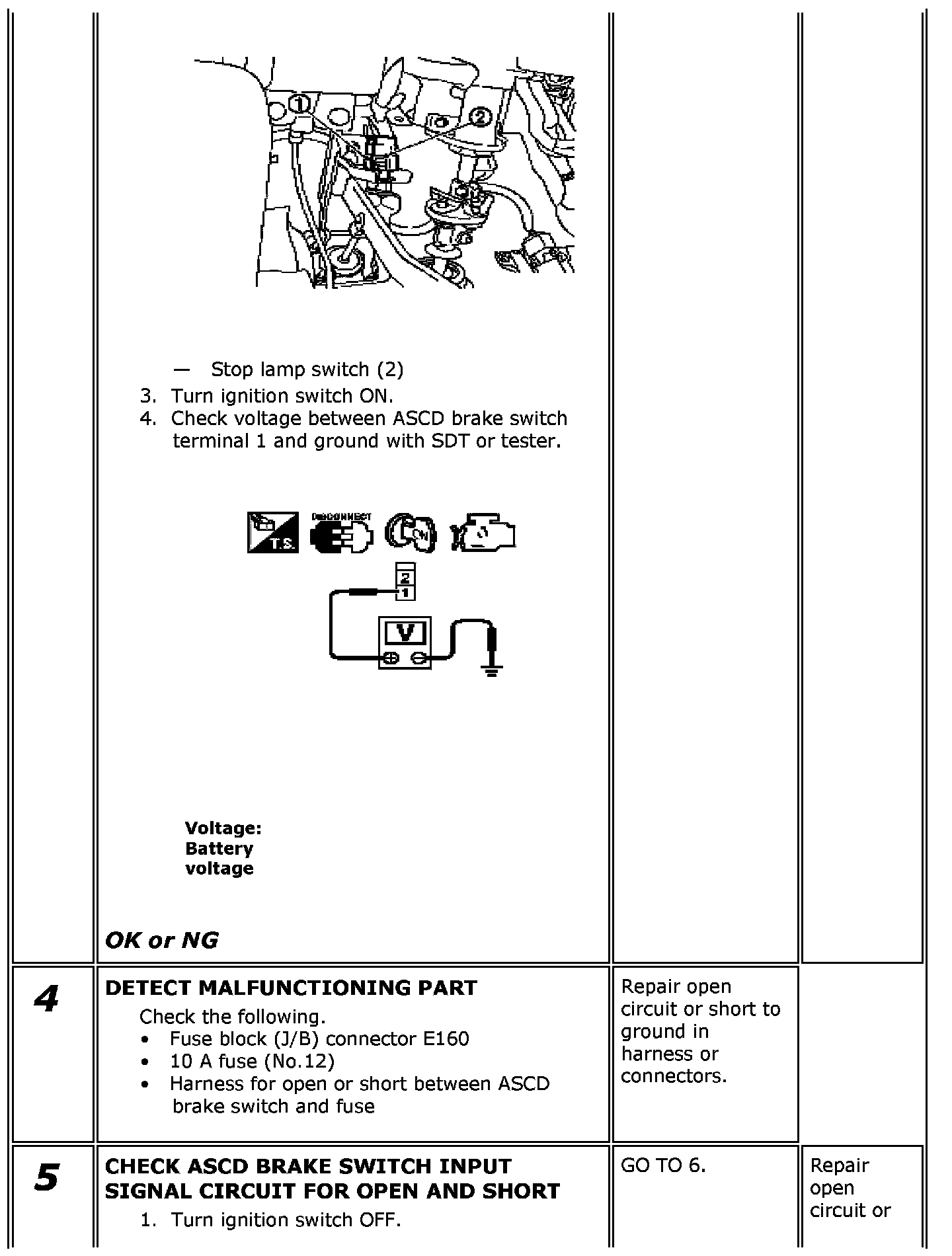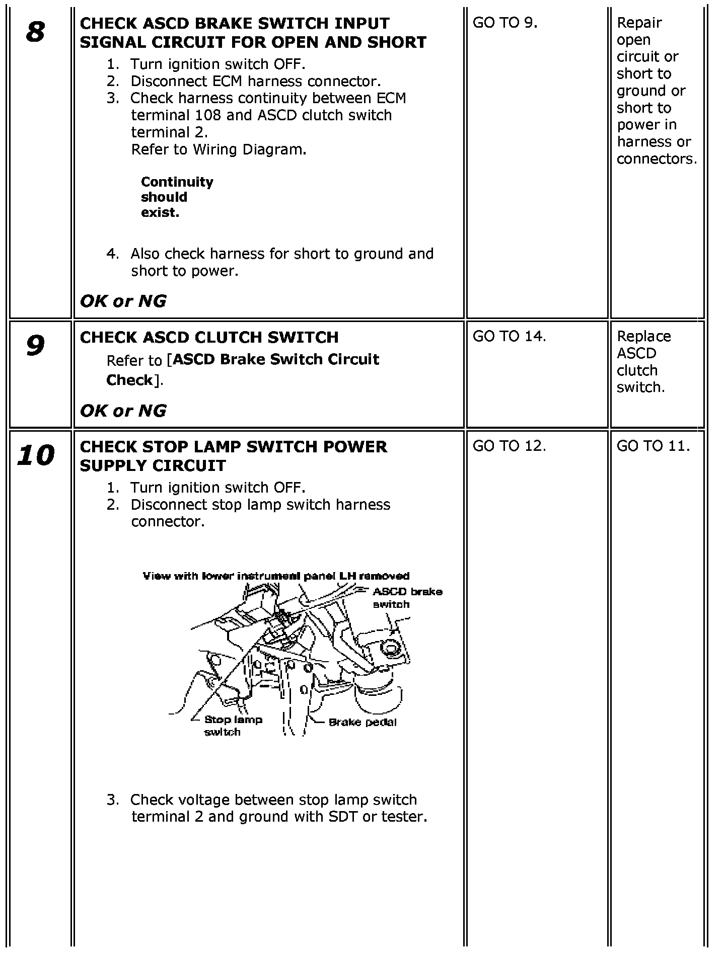 If NG, adjust ASCD brake switch installation, refer to [Brake Pedal: Inspection and Adjustment], Adjustments and perform step 3 again.