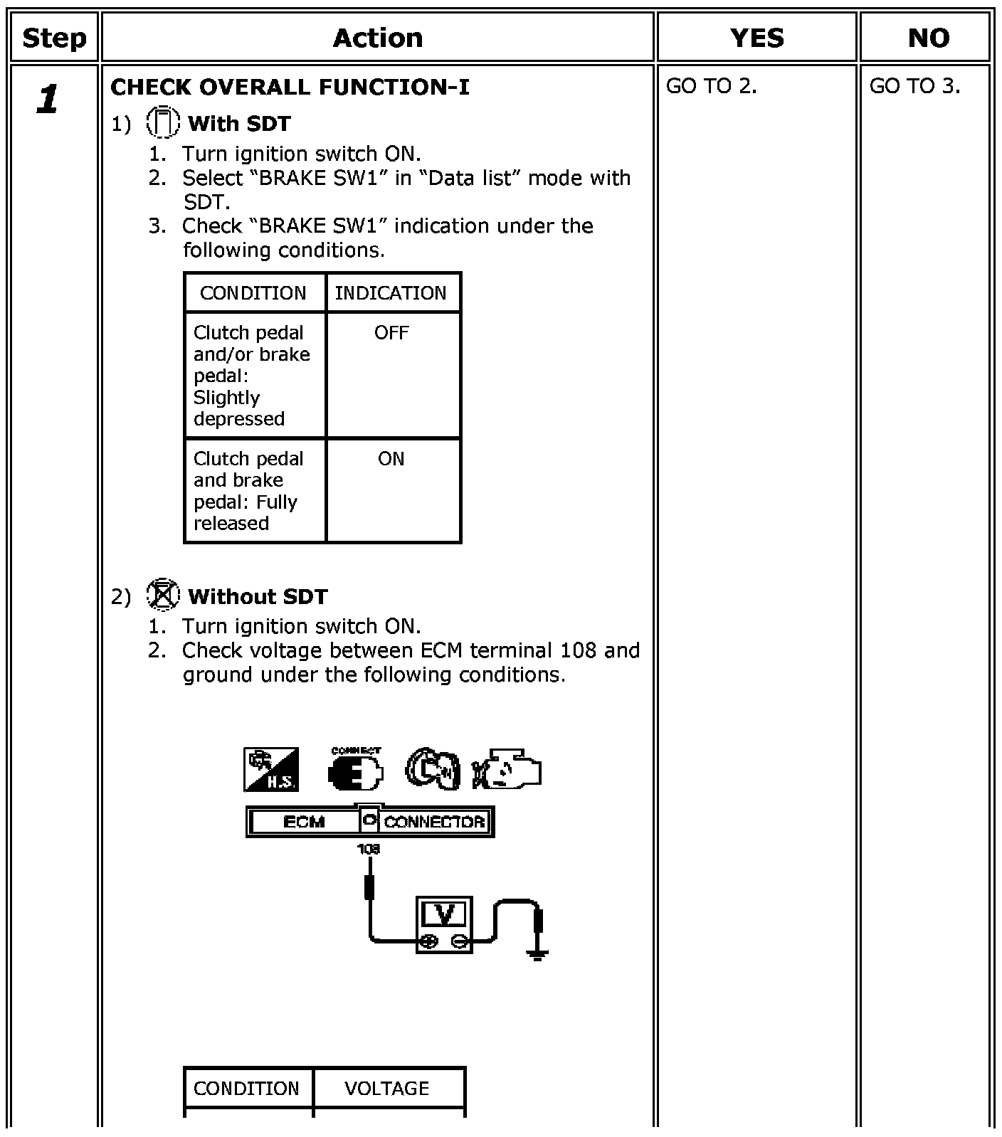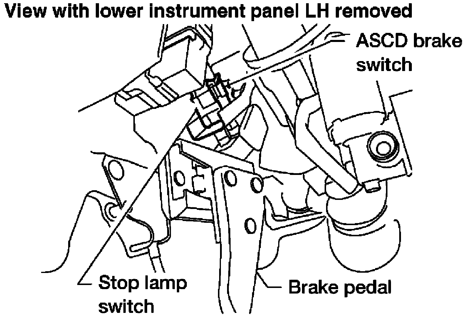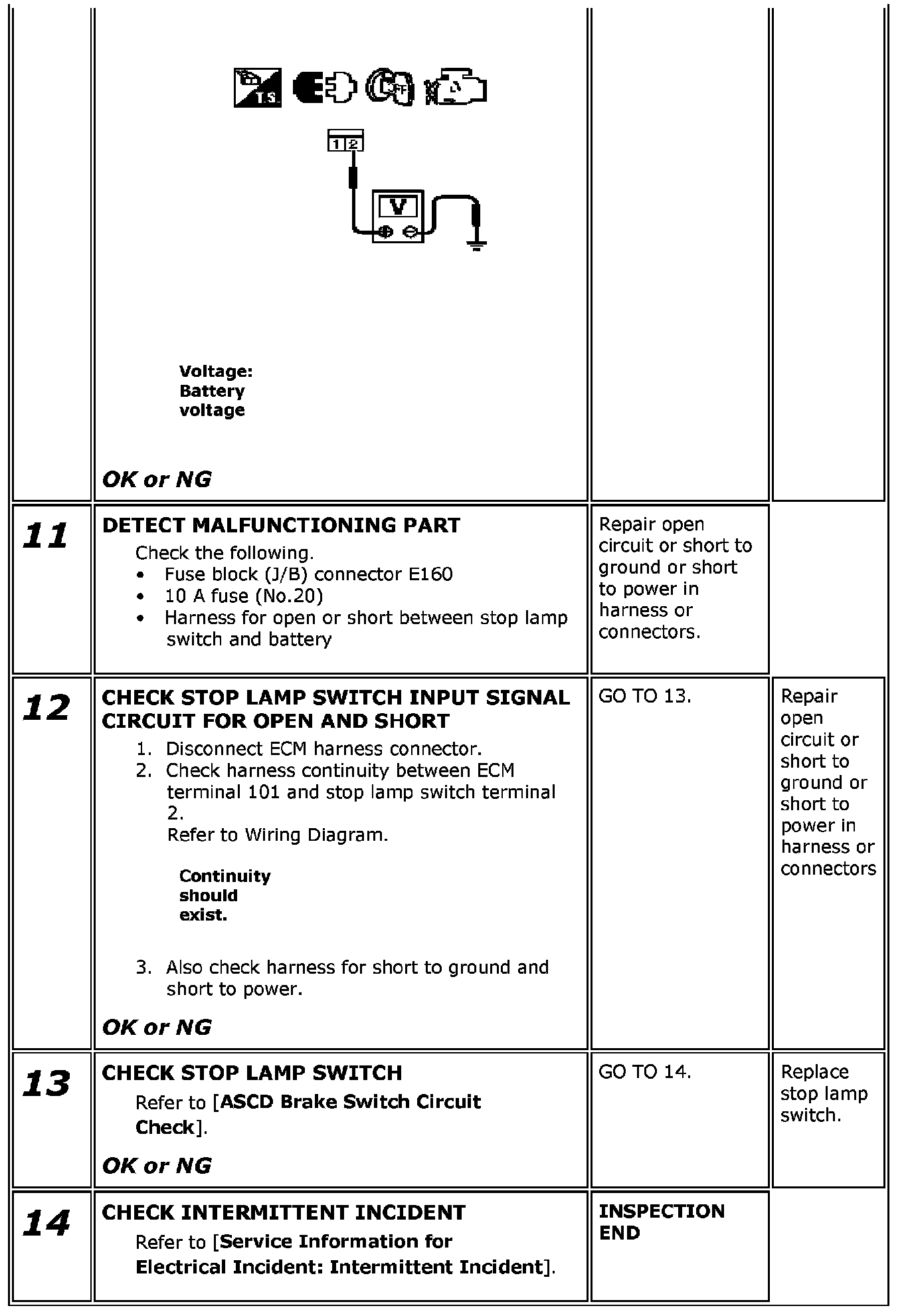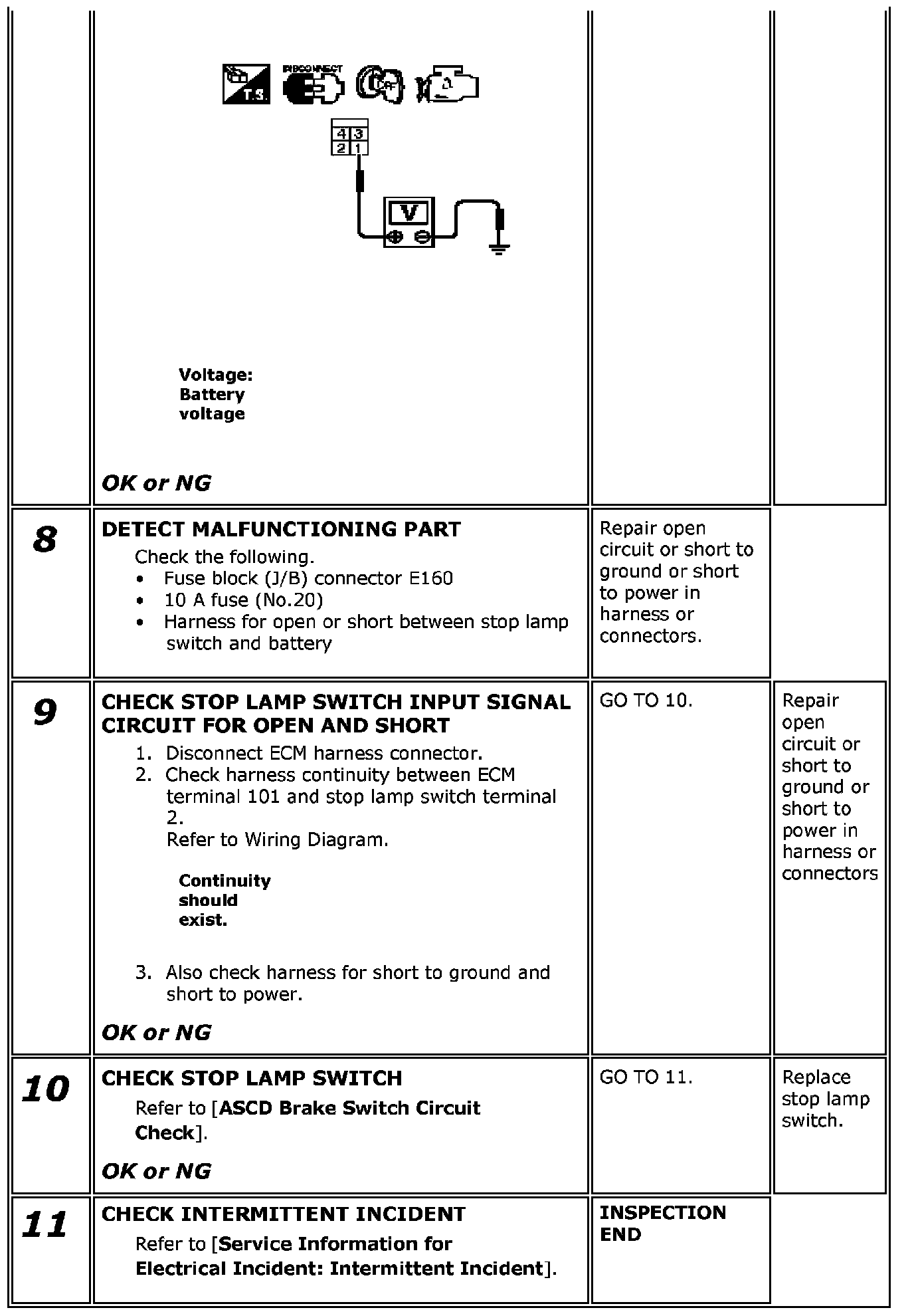 If NG, adjust ASCD brake switch installation, refer to [Brake Pedal: Inspection and Adjustment], Adjustments and perform step 3 again.