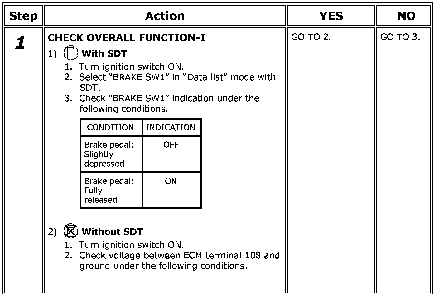 When the brake pedal is depressed, ASCD brake switch is turned OFF and stop lamp switch is turned ON. ECM detects the state of the brake pedal by two types of input (ON/OFF signal).
