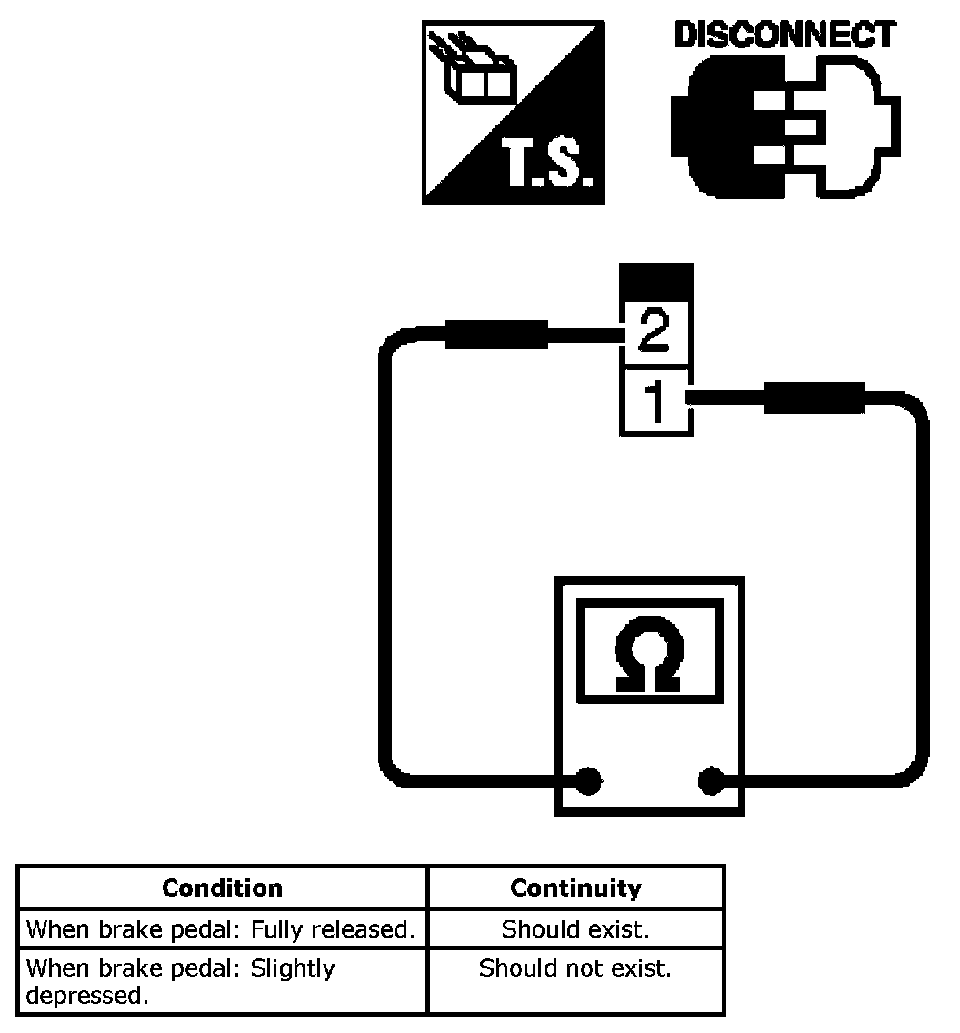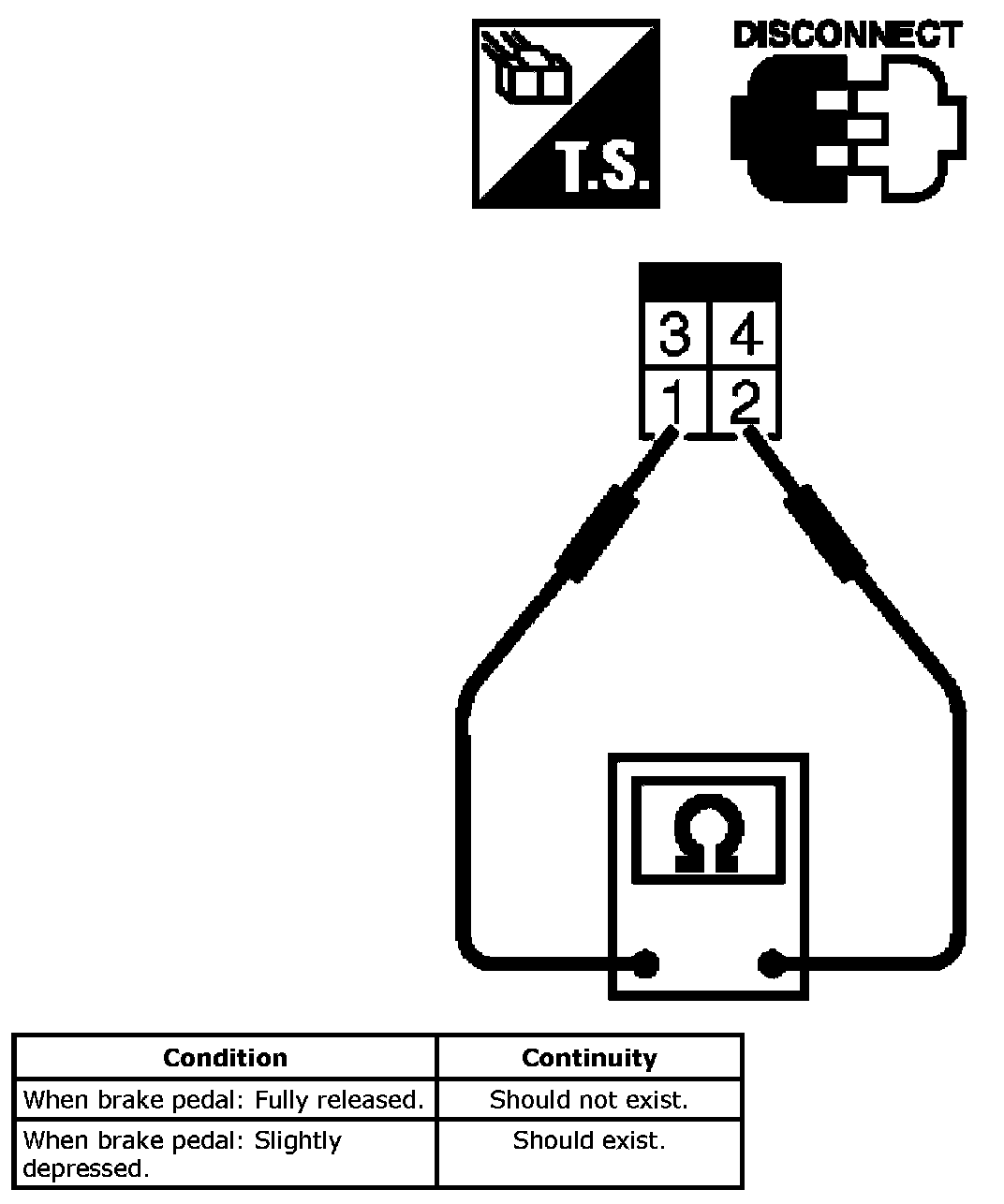 3. Check harness continuity between stop lamp switch terminals 1 and 2 under the following conditions.