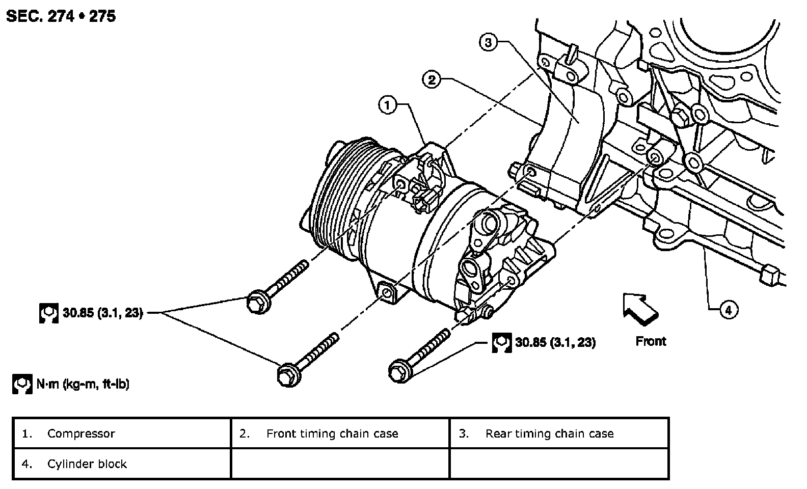 NOTE: For the QR25DE engine, the upper compressor bolt is longer than the other compressor bolts and must be installed in the compressor before positioning the compressor for installation.