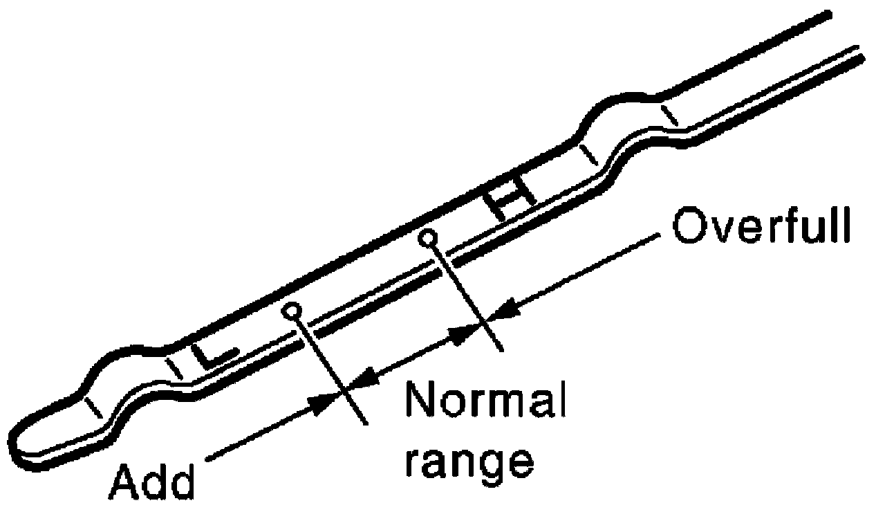 8. Check the oil level using the dipstick as shown. Add oil as necessary and install the oil filler cap. Refer to [Engine Oil Inspection [VQ40DE]].