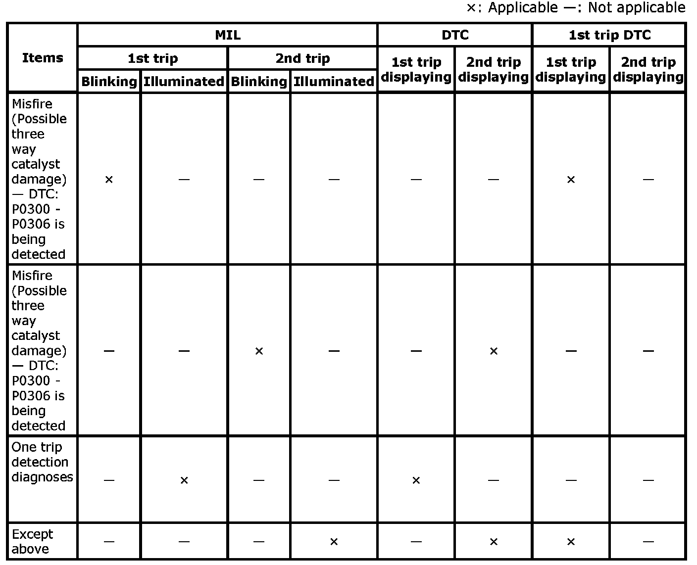 If the same malfunction is detected again during the next drive, the DTC and Freeze Frame data are saved in the ECM memory, and the MIL illuminates. The MIL illuminates at the same time when the DTC is saved. [2nd trip] The "trip" in the "Two Trip Detection Logic" means a driving mode in which self-diagnosis is performed during vehicle operation. Specific on board diagnostic items will cause the ECM to illuminate or blink the MIL, and save DTC and Freeze Frame data, even in the 1st trip, as shown below.