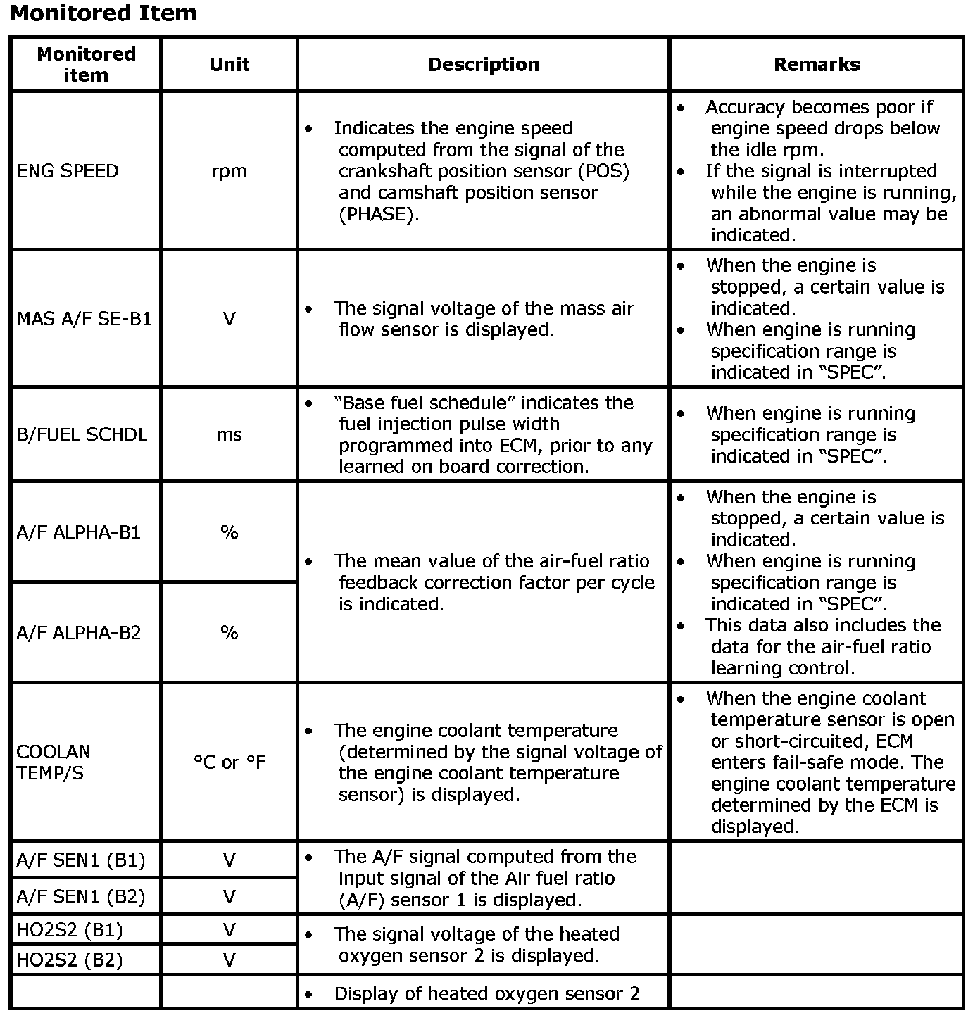 Any monitored item that does not match the vehicle being diagnosed is deleted from the display automatically.