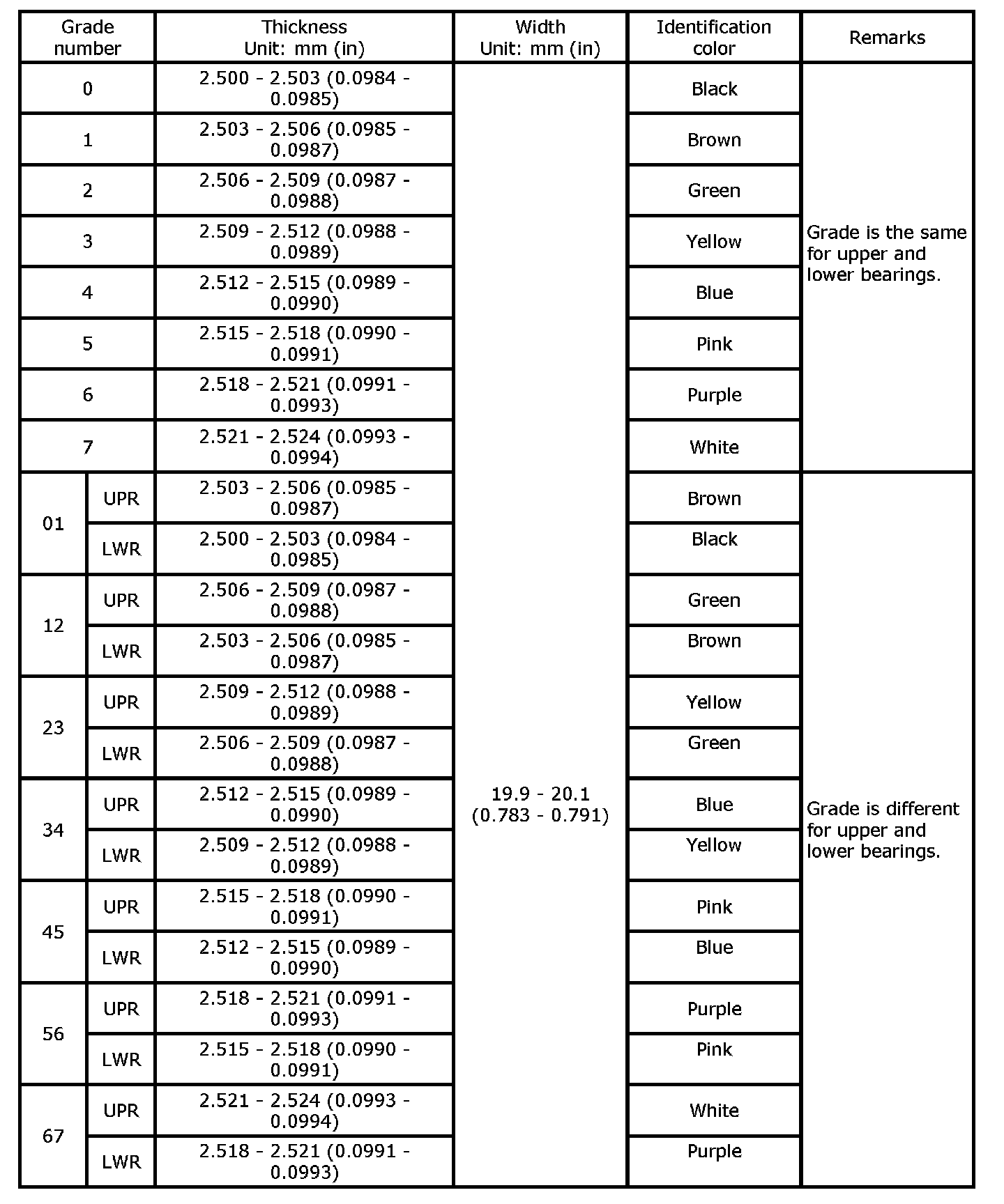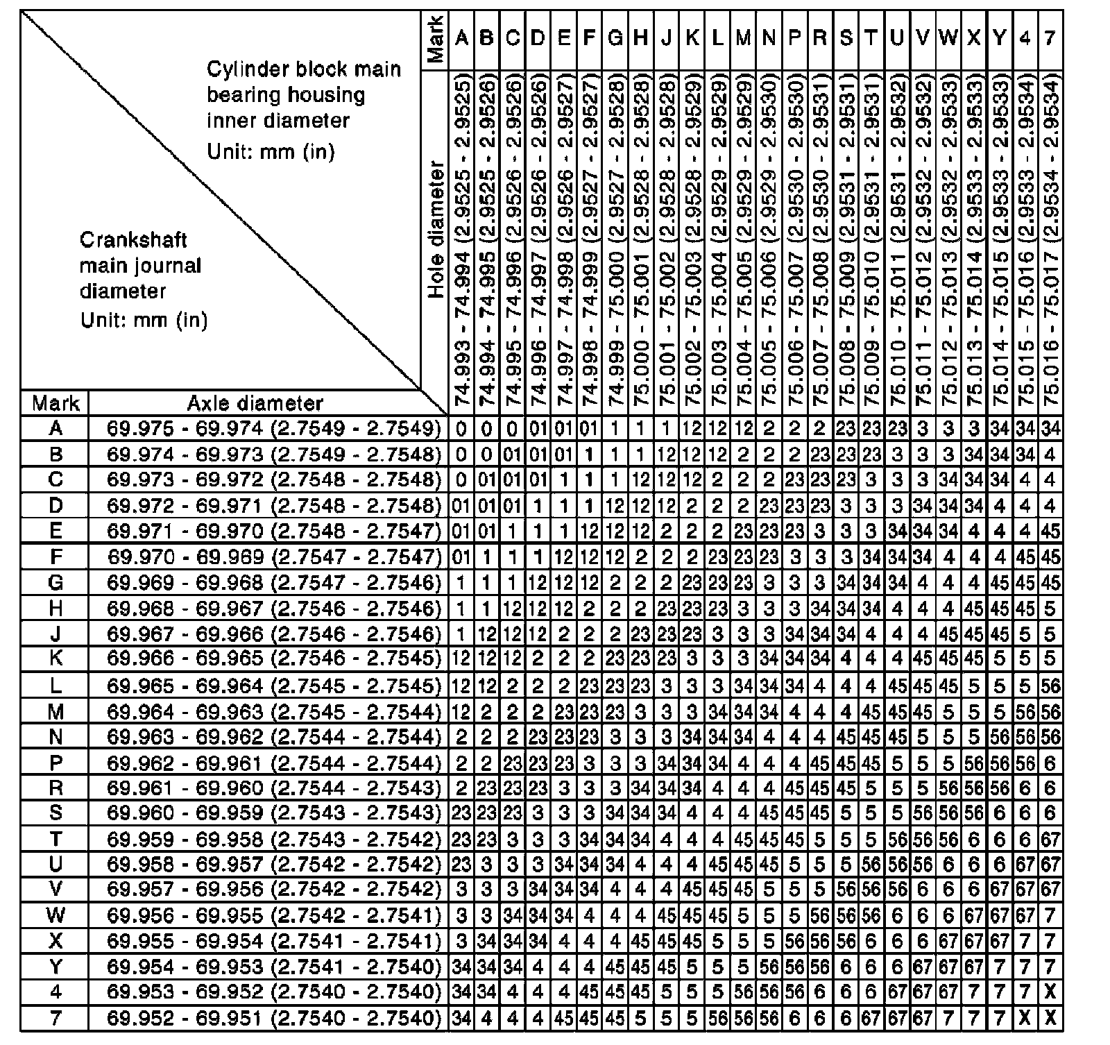 Main Bearing Grade Table (All Journals)