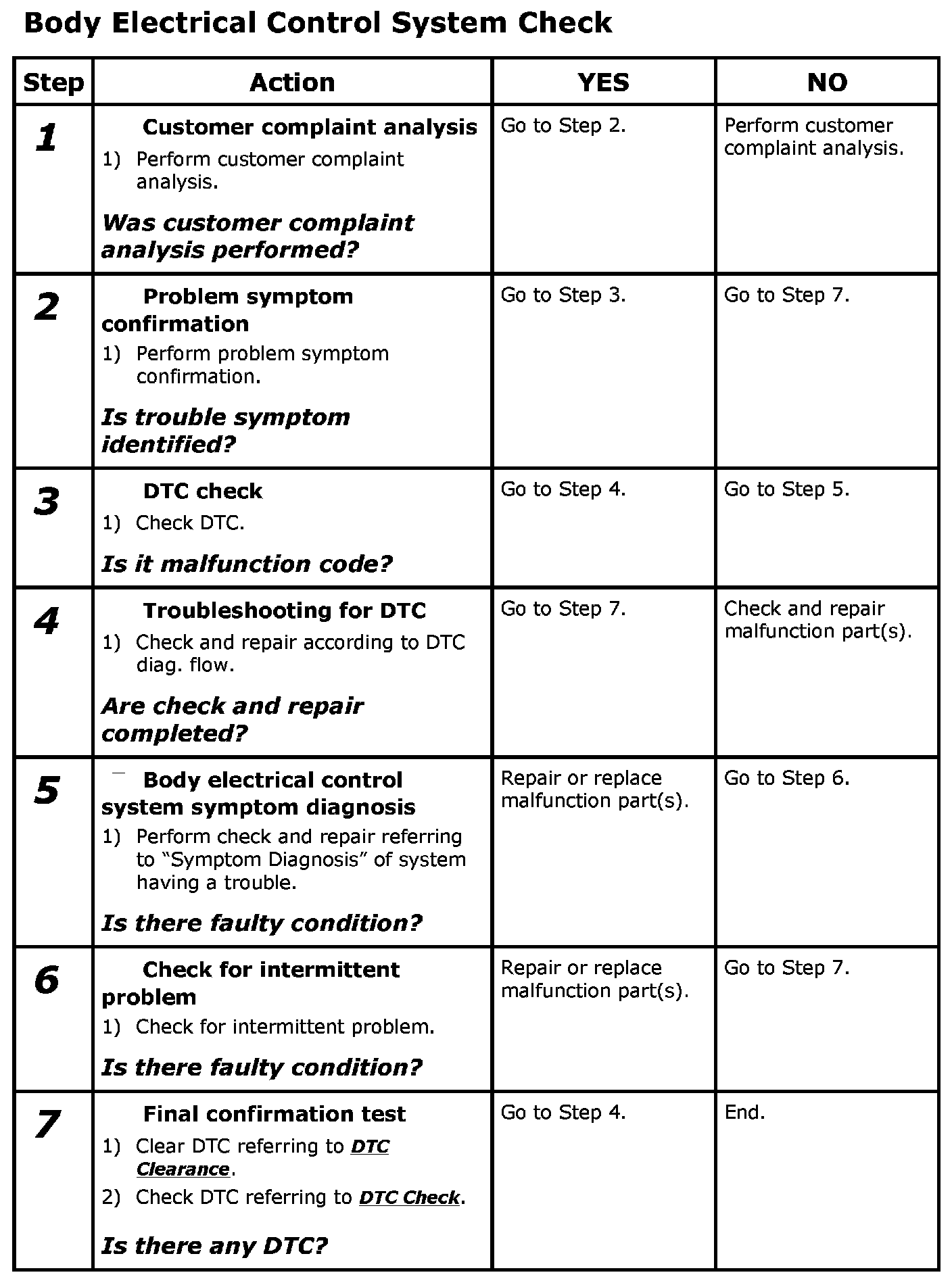 Confirm that the problem symptom has gone and the body electrical control system is free from any abnormal conditions. If what has been repaired is related to the malfunction DTC, check DTC again and confirm that no DTC is indicated.