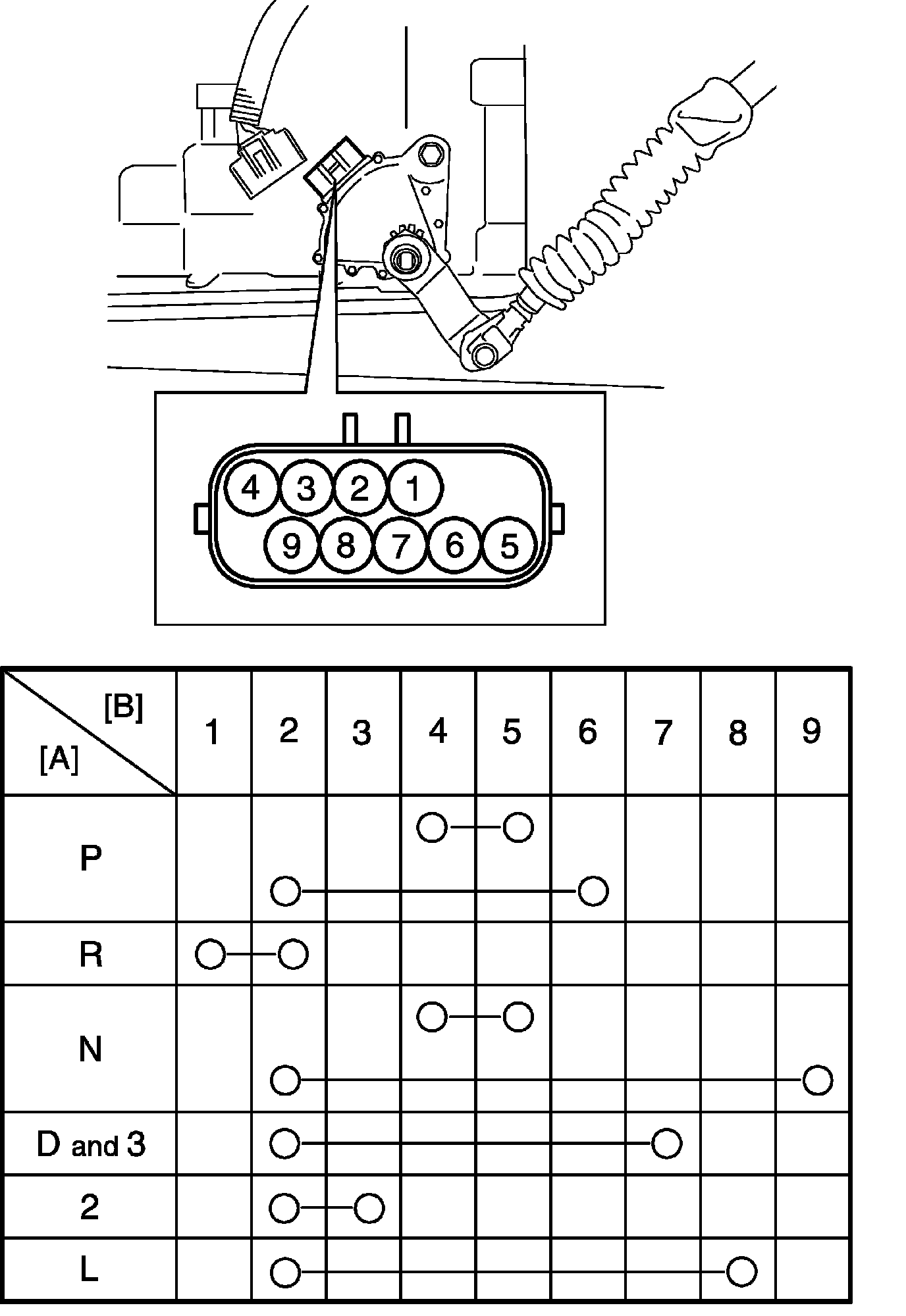 3) Check that engine starts in "N" and "P" ranges but it doesn't start in "D", "3" "2", "L" or "R" range. Also, check that back-up light lights in "R" range.