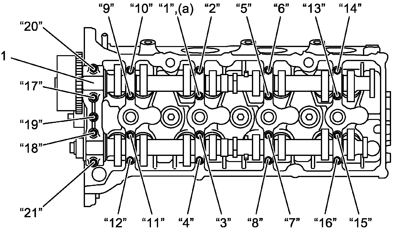 Tighten camshaft housing bolts in numerical order ("1" - "21") evenly and gradually.