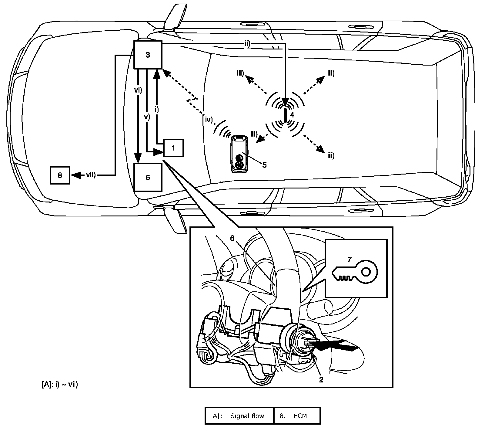 When the ignition knob switch (2) installed to the steering lock unit (1) is pushed, the keyless start control module (3) activates the center antenna (4) to send out the request signal in the vehicle compartment. When the remote controller (5) receives the request signal from the center antenna, it transmits the ID code to the keyless start control module. The keyless start control module compares the ID code sent by the remote controller with the ID code registered in the keyless start control module. When these ID codes match, the keyless start control module makes the key indicator light (7) in the combination meter (6) light in blue and unlocks the steering lock unit to enable the ignition knob switch to turn. When the ignition knob switch is turned to ON position in this state, ID codes of ECM and keyless start control module are compared through CAN communication (immobilizer function). When they match, turning the ignition knob switch to start position will start the engine.