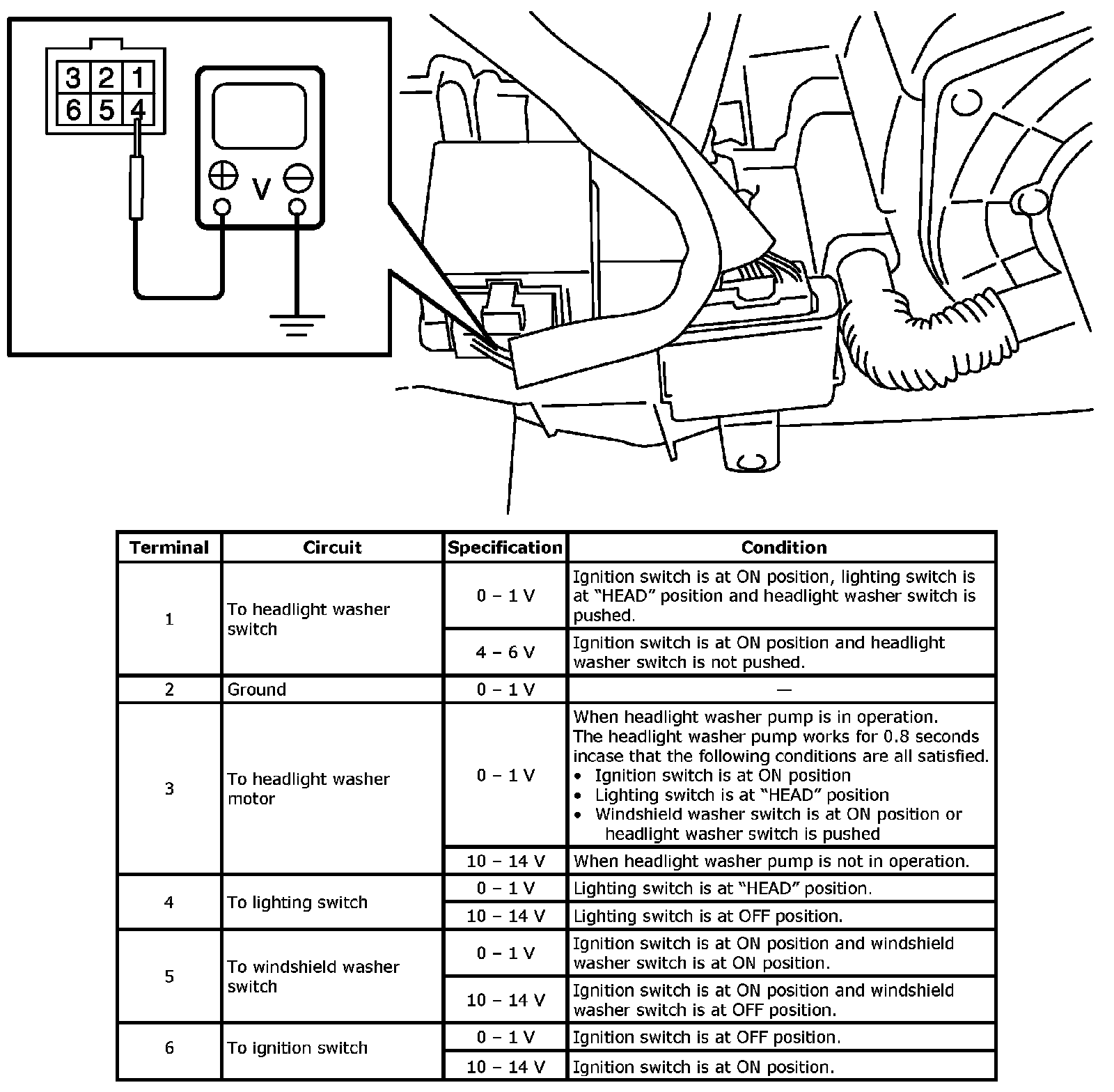 If measuring voltage is not within specification, first check related switch and applicable wire harness circuit for open or short. And if all wire harness circuits and connections are normal, replace headlight washer control module.