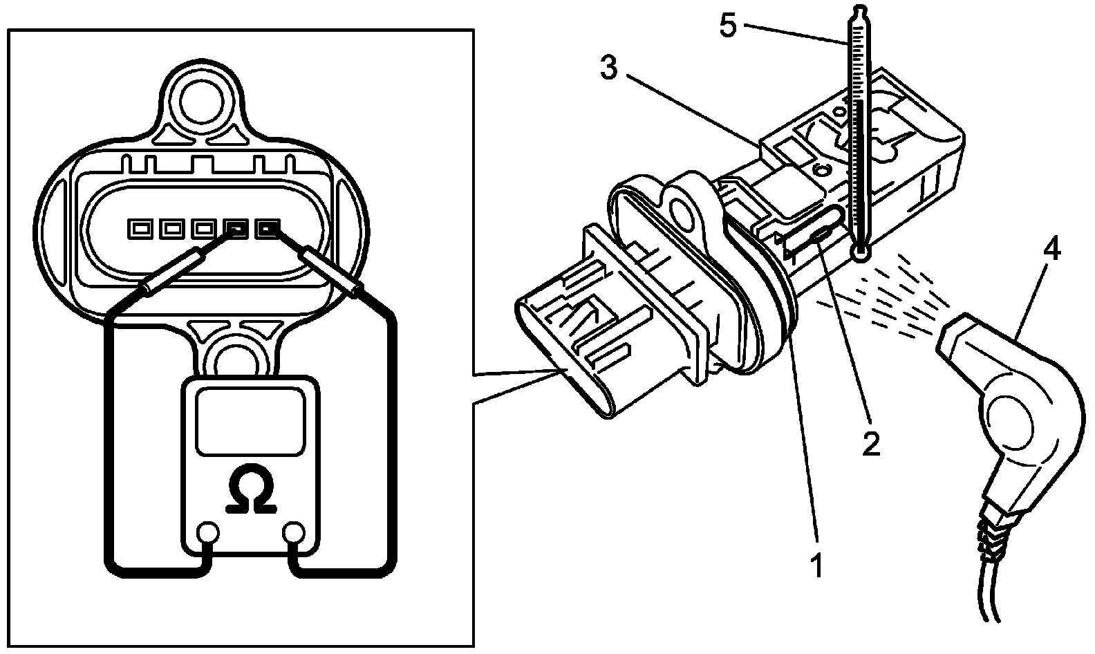 3. Measure resistance between sensor terminals while blowing hot air to temperature sensing part (2) of MAF & IAT sensor (3) using hot air drier (4).