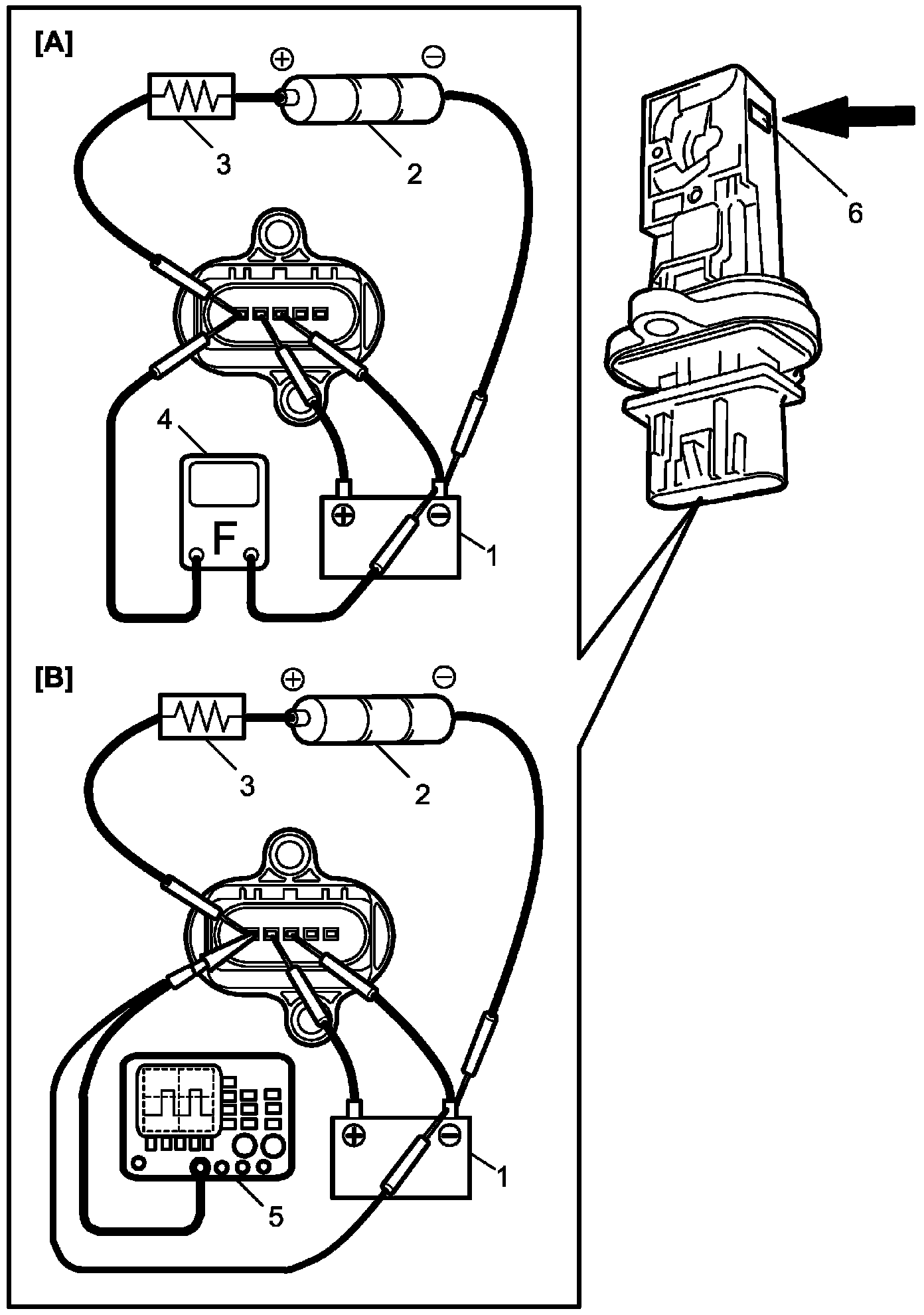 4. Connect oscilloscope (5) or multimeter (4) to MAF sensor as shown in figure.