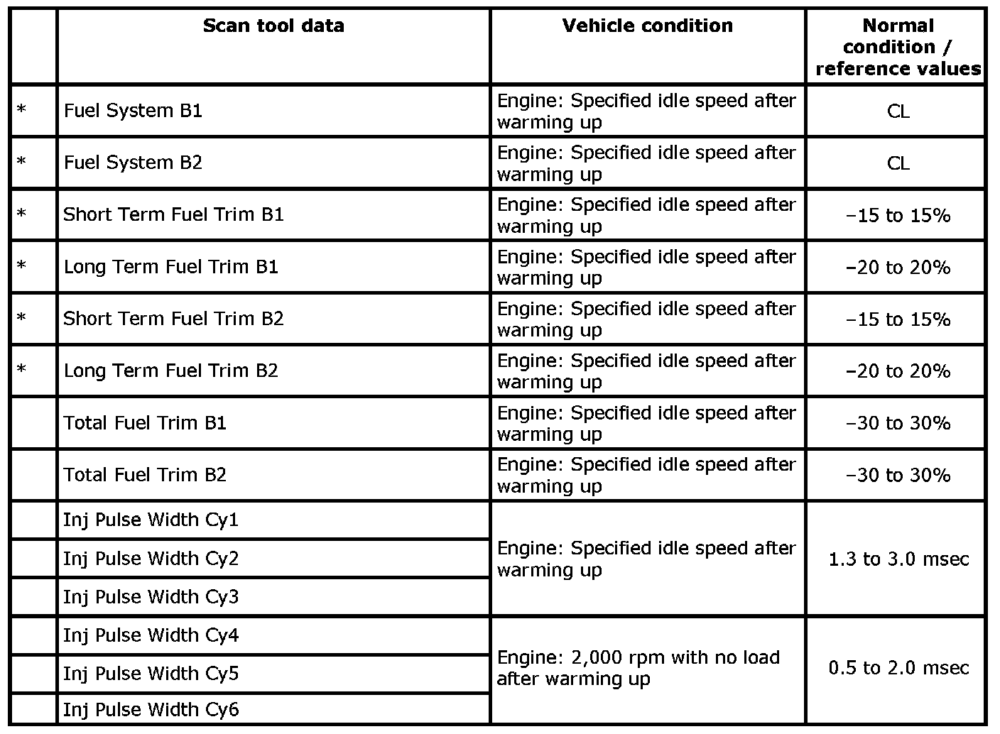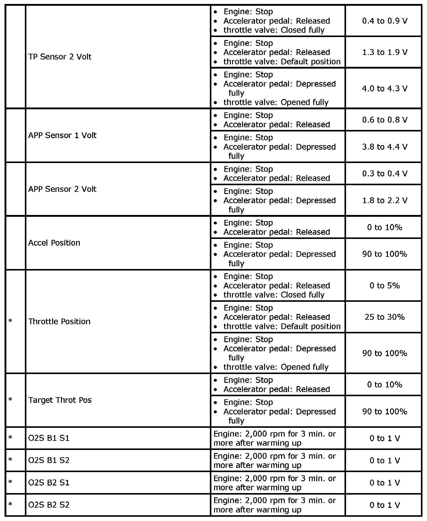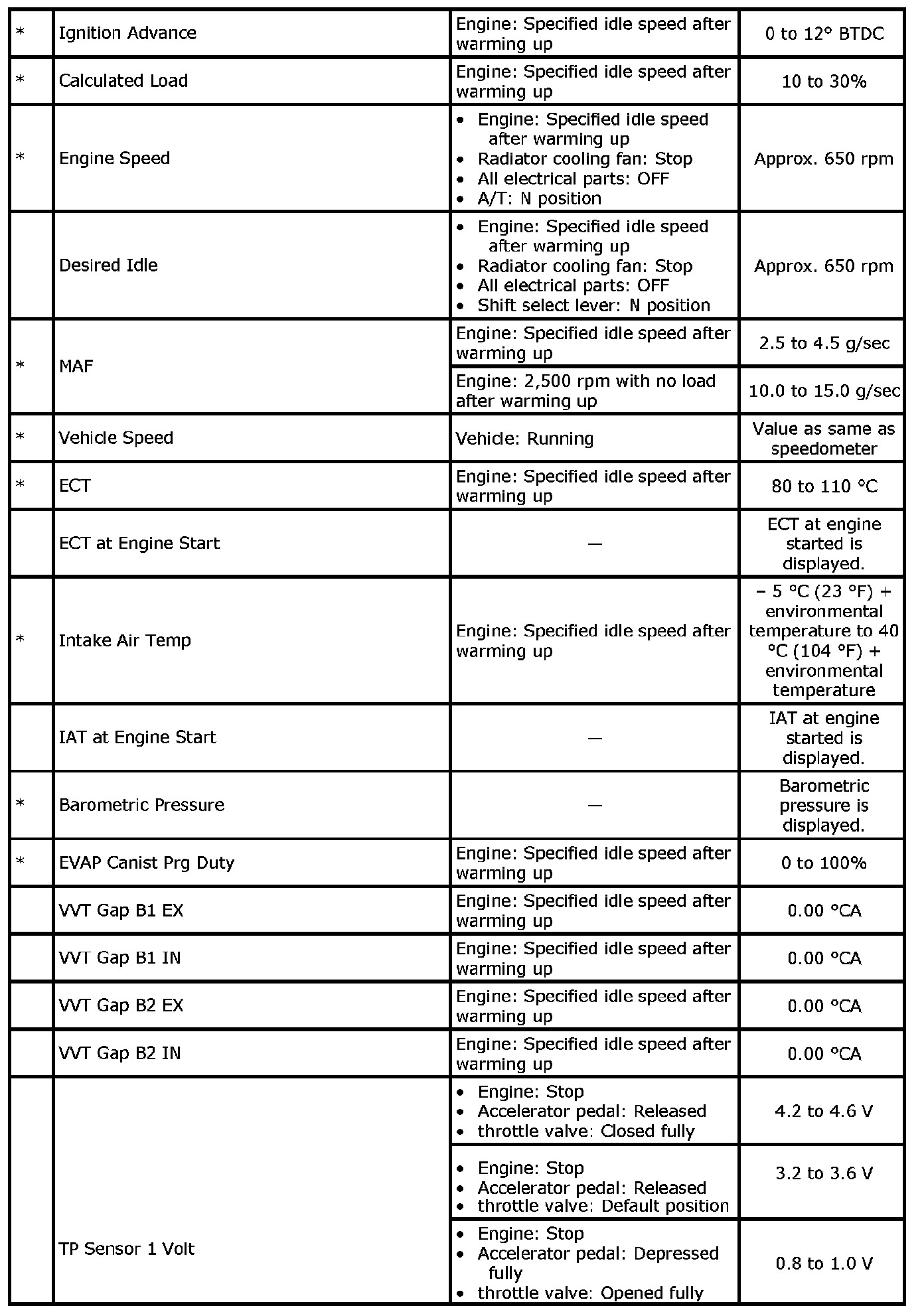 - With the generic scan tool, only star (*) marked data in the following table can be read.