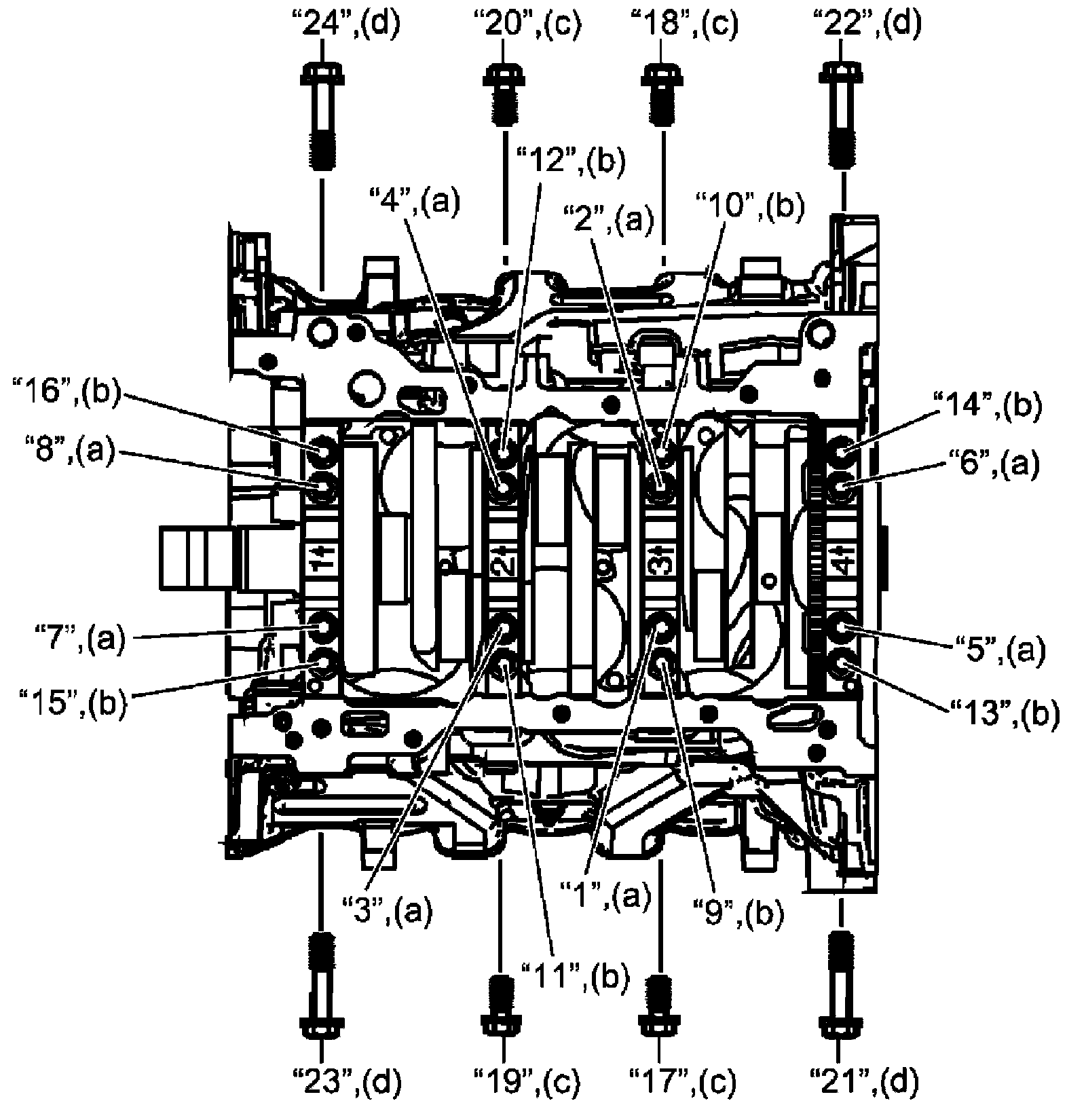 Tighten new main bearing cap side bolts No.1 and new main bearing cap side bolts No.2 to 30 Nm (3.1 kgf-m, 22.5 lbf-ft) in numerical order ("17". "24") shown in figure evenly and gradually.