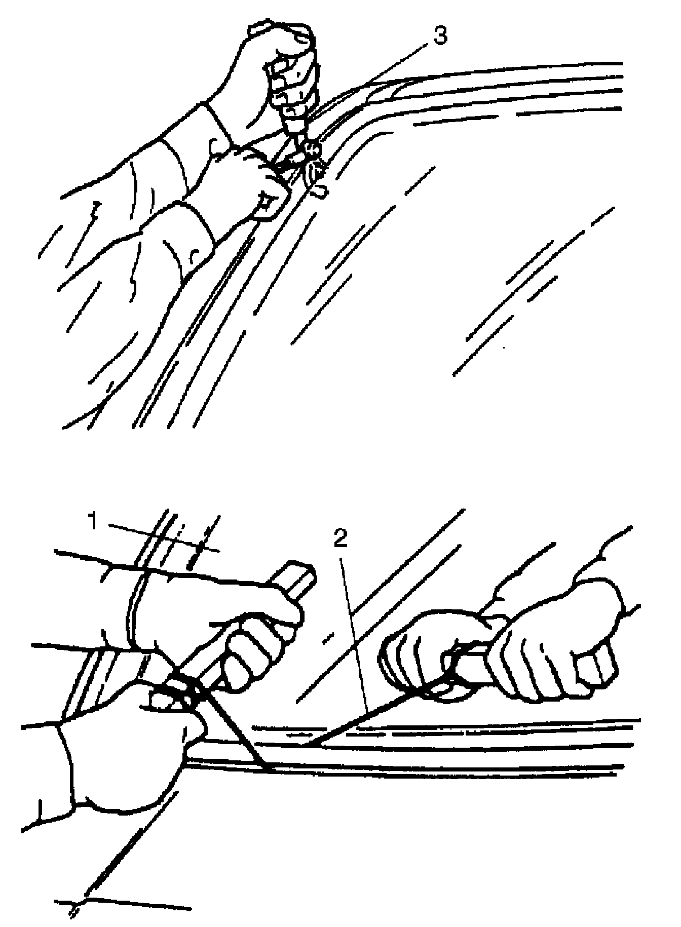 10. Cut adhesive all around windshield (1) with piano string (2). When using tool, windshield knife (3), to cut adhesive, be careful not to cause damage to windshield. Use wire to cut adhesive along lower part of windshield.