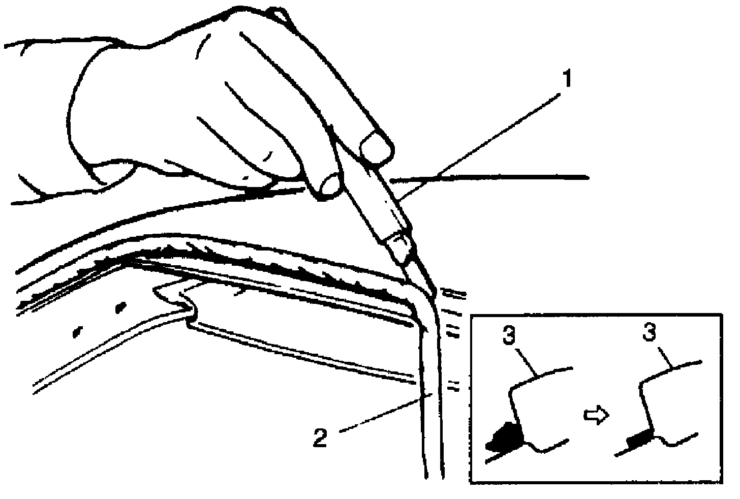 11. Using knife (1), smoothen adhesive (2) remaining on body side (3) so that it is 1 - 2 mm (0.039 - 0.078 in.) thick all around.