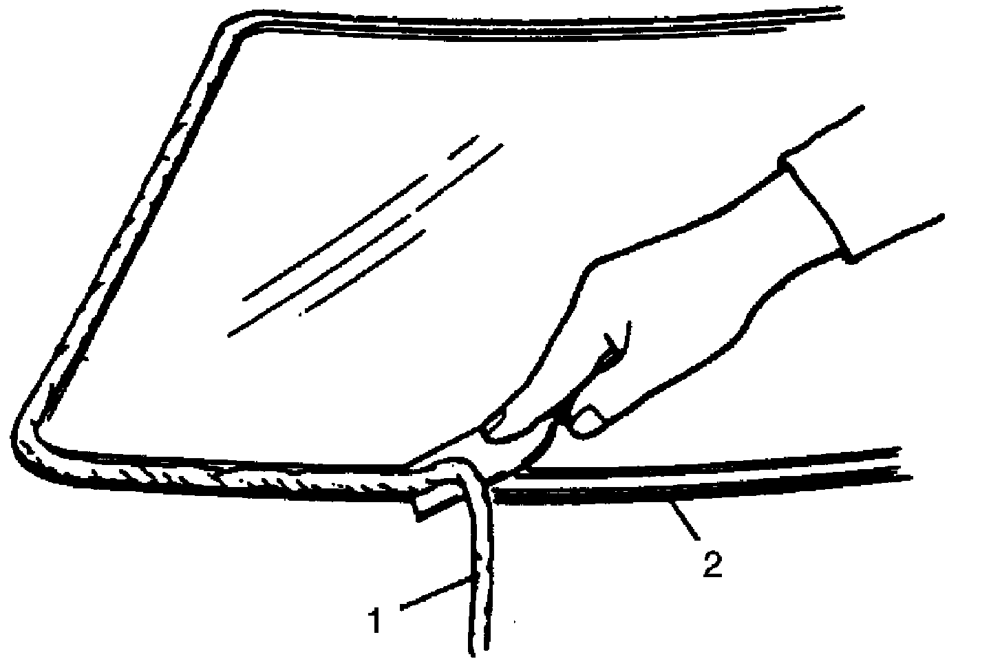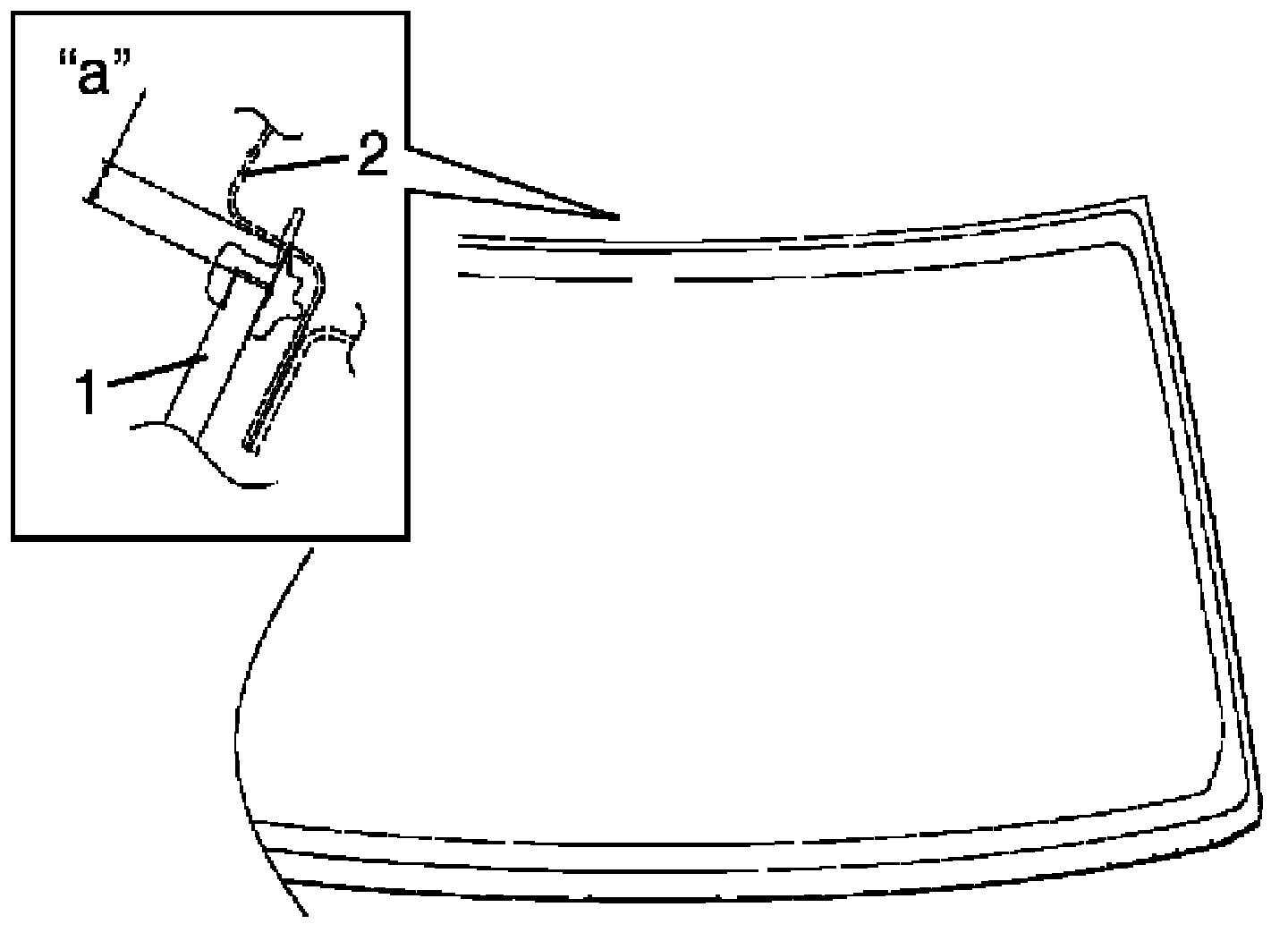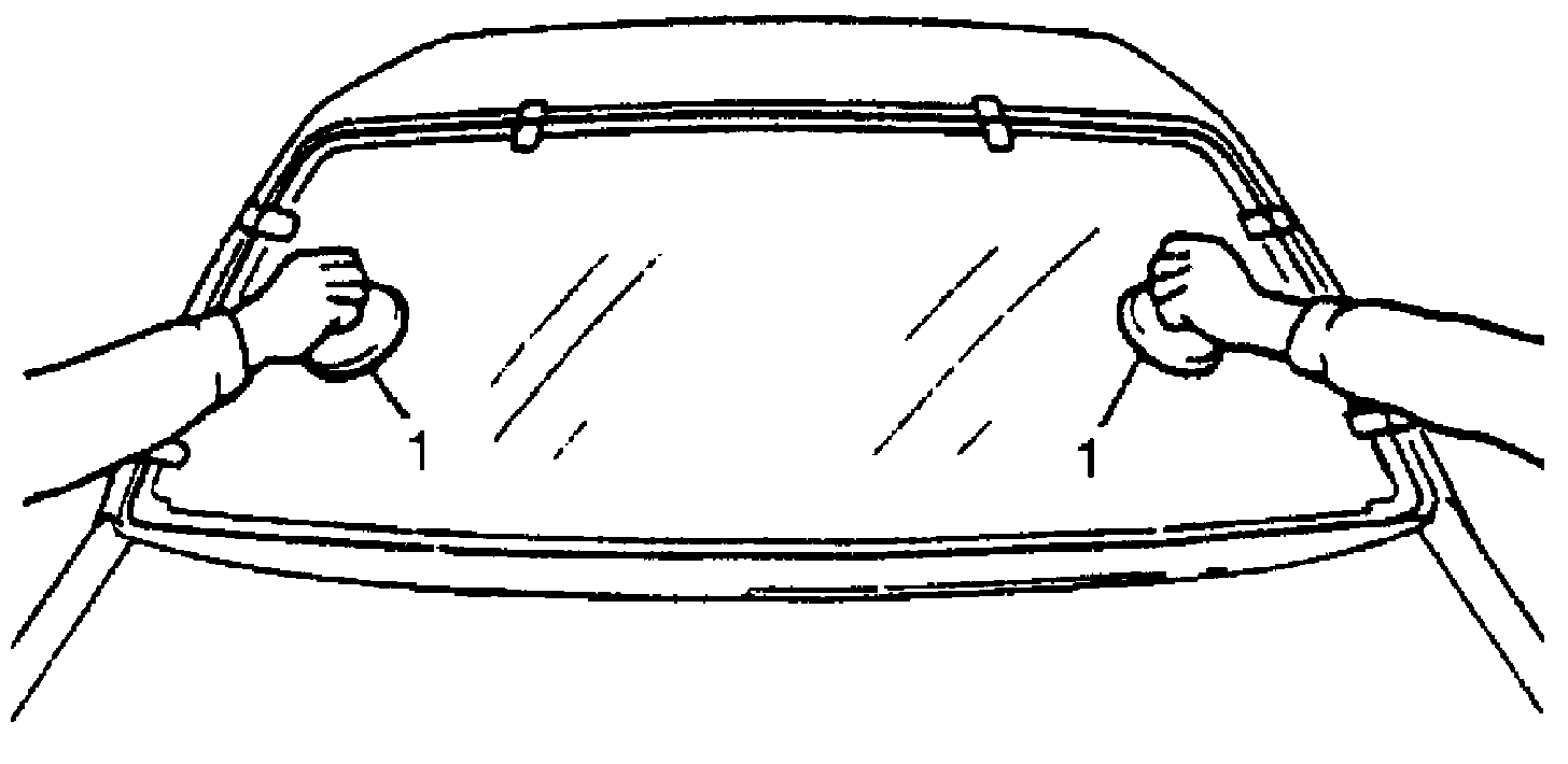 12. When reusing windshield, remove the adhesive (1) from it, using care not to damage primer coated surface (2).