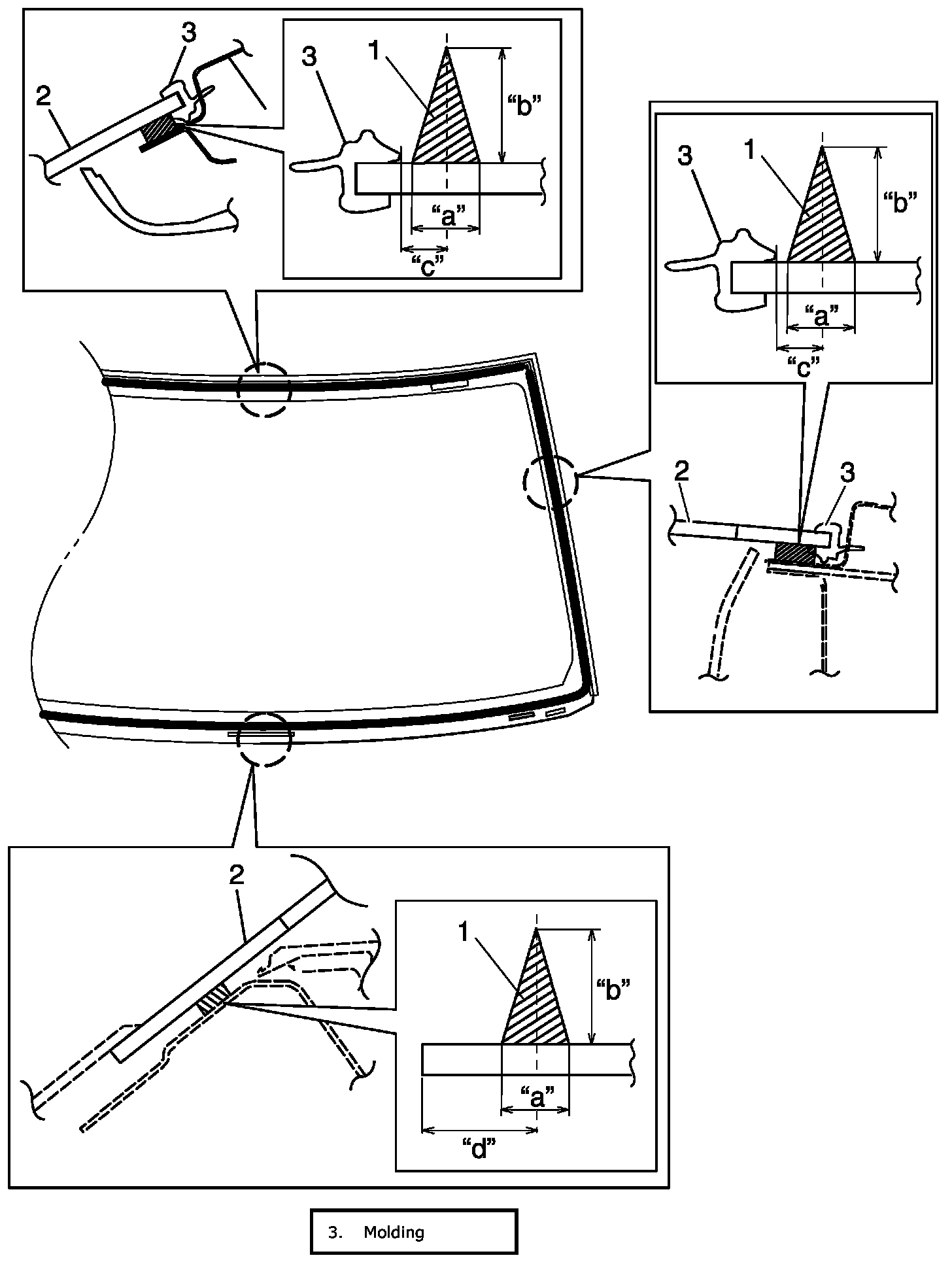 - Press glass (2) against fittings surface of body panel quickly after adhesive (1) is applied.