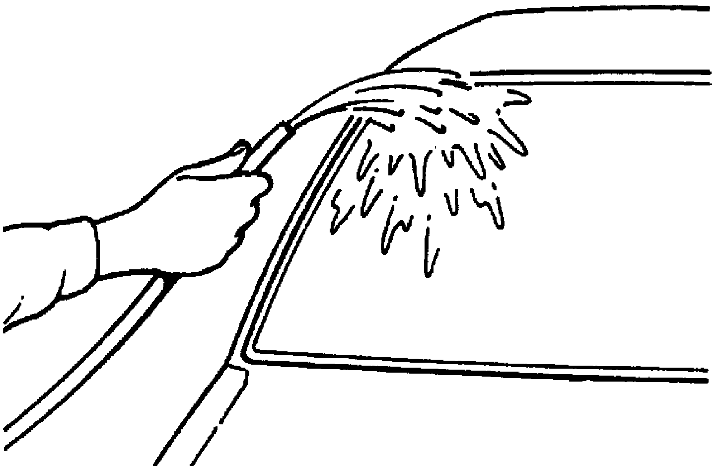 11. Check for water leakage by pouring water over windshield through hose. If leakage is found, dry windshield and fill leaky point with adhesive. If water still leaks even after that, remove glass and start installation procedure all over again.