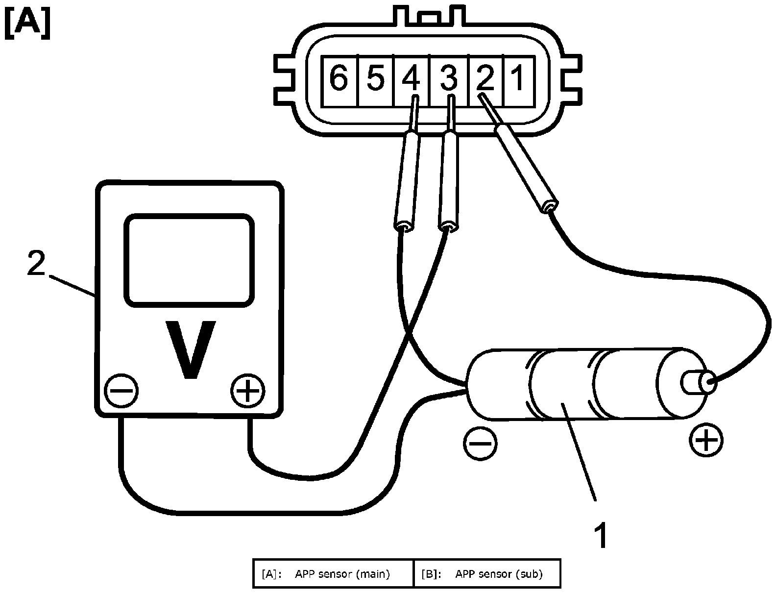 b. Connect voltmeter (2) and batteries to APP sensor as shown in figure.