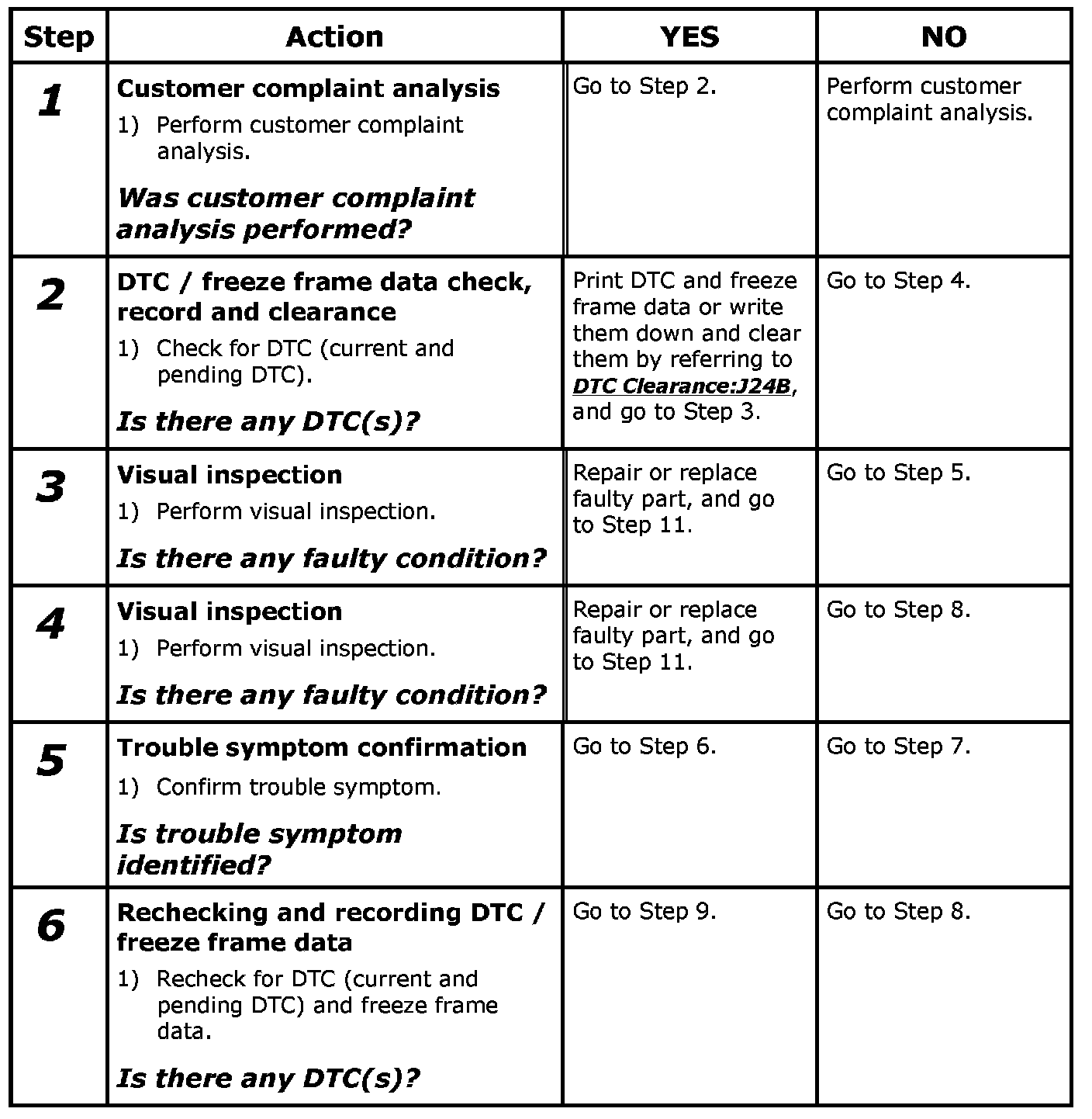 2. In case there is no faulty part found in inspection procedure of "Engine basic inspection", perform Engine Symptom Diagnosis:J24B based on symptom found in vehicle checking in the following steps. Engine Symptom Diagnosis