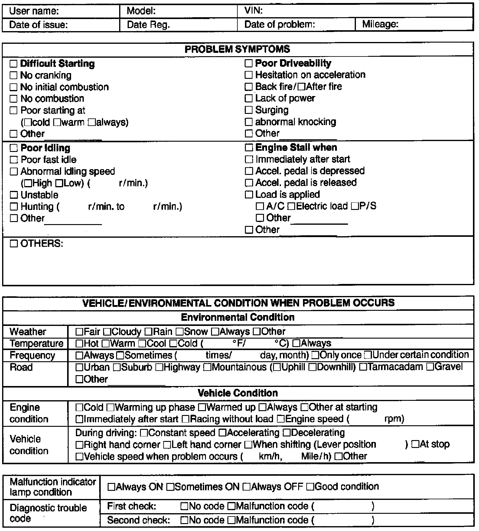 Record details of the problem (failure, complaint) and how it occurred as described by the customer. For this purpose, use of such an inspection form will facilitate collecting information required for proper analysis and diagnosis.