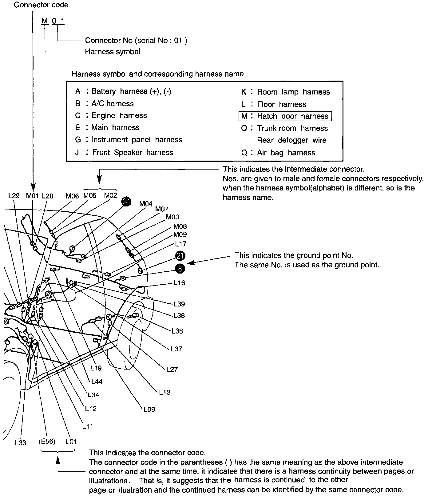 Each connector is identified by the code consisting of the harness symbol and the connector serial number as shown in the image. As each code is assigned to each connector in System Circuit Diagram, it is easily possible to retrieve where the connector in question is located by using its code. To locate the connectors, all you have to do is to look for the same code in Connector Layout Diagram.