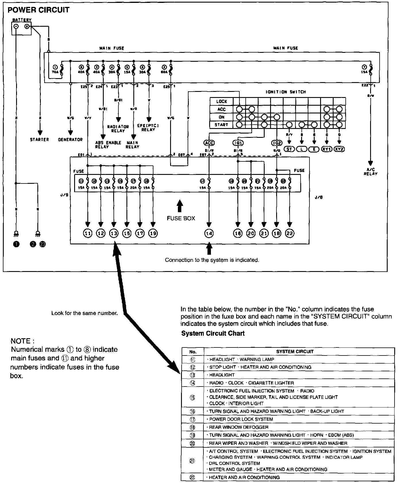 Power circuit shows the circuit from the positive terminal of the battery to each fuse in the fuse box and where each fuse is connected (each system circuit name ). In addition, the electric load value of each fuse is indicated.
