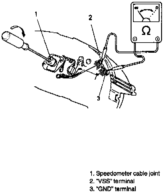 - Connect ohmmeter between "VSS" terminal and "GND" terminal of combination meter and turn cable joint of speedometer with a screwdriver. Ohmmeter indicator should move back and forth between 0 (zero) and (infinity) 4 times while cable joint is turned one full revolution. Replace speedometer if check result is not satisfactory.